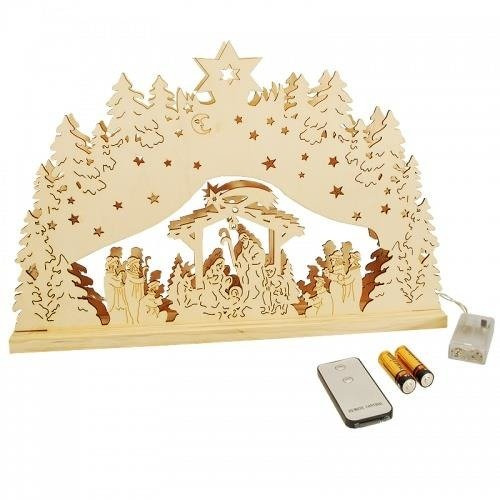 Rozświetlona od wewnątrz drewniana szopka o szerokości 45 cm. W środku lampki LED. Otwory w kształcie ornamentów świątecznych. Może mieć zastosowanie do zdobienia dużych choinek domowych, okien oraz do dowolnej aranżacji przestrzeni wewnątrz pomieszczeń. W zestawie pilot zdalnego sterowania oraz 2 baterie typu AA.
