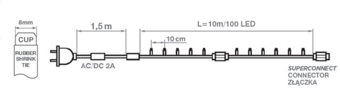 ,Lampki choinkowe LED do zastosowania zarówno na zewnątrz jak i do wewnątrz z kolekcji złotej z 100 diodami LED o długości 10mb. Lampki świąteczne znajdują zastosowanie szczególnie do ozdabiania choinek, drzew, krzewów, okien, aranżacji wewnętrznej i zewnętrznej oraz do dowolnego oświetlenia świątecznego. Poprzez zastosowanie wysokiej jakości diod LED lampki choinkowe cechują się znikomym poborem mocy oraz długą żywotnością. Lampki ledowe zakończone są hermetycznym gniazdem 230V dzięki czemu istnieje możliwość podłączenia do 10 zestawów. Dzięki wysokiej jakości diod posiadają duży kąt świecenia oraz zastosowanie technologii LED daje znikomą emisję ciepła. Lampki można stosować w niskich temperaturach i przy dużej wilgotności powietrza.
