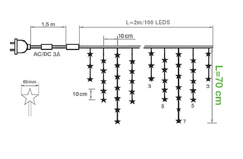 ,Kurtynka świetlna LED typu "Gwiazdki" potocznie zwana soplami, sopelkami itp. do zastosowania wewnątrz z kolekcji brązowej z 100 diodami LED o długości 2x0,7m. Przedstawiona kurtyna LED znajduje zastosowanie głównie do ozdabiania wnętrz. Jakość kurtynek i odporność na uszkodzenia oraz promieniowanie UV jest wysoka. Zasilanie 230V. Potrzebna moc to 3,6W. Małe zużycie mocy pozwala projektować świąteczną (i nie tylko) iluminację świetlną, nie ryzykując wysokiego rachunku za prąd.