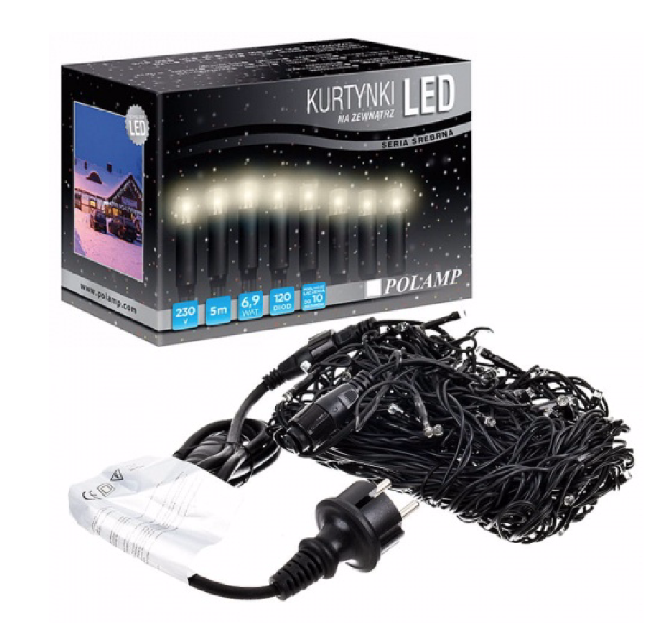Kurtynka świetlna LED typu "Sople" z efektem FLASH do zastosowania zarówno na zewnątrz jak i wewnątrz z kolekcji srebrnej z 120 diodami LED o długości 5mb. Kurtyny LED znajdują zastosowanie szczególnie do ozdabiania elewacji, okien, balkonów, tarasów, dachów oraz aranżacji wewnętrznej i zewnętrznej. Kurtynki LED "Sople" na całej swej długości posiadają ułożone pionowo sznury z diodami LED w powtarzających się ilościach 3/5/7/5/3. Kurtyny posiadają co 5 diodę FLASH, które powodują niesamowity efekt błysku. Funkcja ta działa automatycznie. Poprzez zastosowanie wysokiej jakości diod LED kurtyny świetlne LED cechują się znikomym poborem mocy oraz długą żywotnością. Zakończone są hermetycznym gniazdem 230V dzięki czemu istnieje możliwość podłączenia do 10 zestawów.