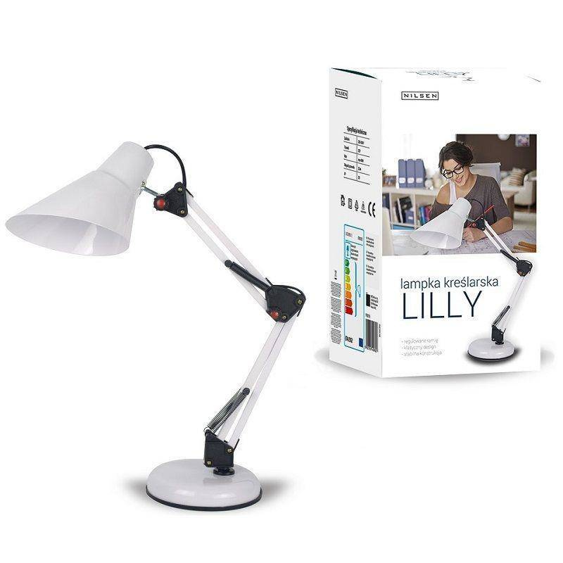 Lampka biurkowa kreślarska Lilly to uniwersalna propozycja do pracy lub nauki. Klasyczna konstrukcja z nowoczesnymi akcentami, pozwala wprowadzić ją do wielu nowoczesnych przestrzeni. Biały kolor z czarnymi elementami sprawia, że lampka wygląda świeżo i delikatnie. Składające się z dwóch części regulowane ramię i ruchoma główka, pozwalają na dopasowanie wysokości i kąta padania światła do własnych potrzeb, a półotwarty klosz daje dużo skupionego światła. Lampka biurkowa Lilly sprawdzi się zarówno na biurku ucznia, na biurku do pracy, a także jako dodatkowe oświetlenie w salonie, w kąciku do czytania czy na stoliku nocnym. Lampka wyposażona w trzonek E27 na wymienne źródła światła, który pozwala na dopasowanie barwy i strumienia świetlnego do własnych potrzeb. Klasyczny włącznik na przewodzie umożliwia wygodne uruchomienie lampki. Cechy wyróżniające lampkę biurkową kreślarską Lilly: