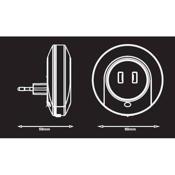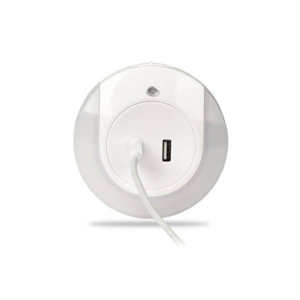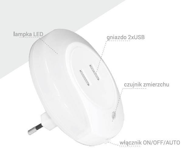 Lampka nocna wtykowa LED 0.4W 15lm z czujnikiem zmierzchu i gniazdem 2xUSB