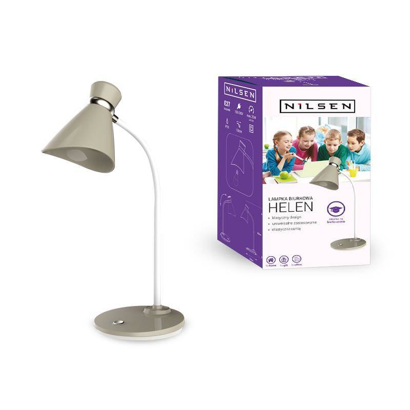 Lampka biurkowa Helen na wymienne źródło światła E27 to idealna propozycja oświetlenia na biurko ucznia lub biurko do pracy. Prosta, lekka konstrukcja sprawdzi się w klasycznie urządzonych wnętrzach. Szary kolor nadaje lampce bardzo uniwersalnego charakteru, który świetnie będzie współgrał z pozostałymi elementami wnętrza. Lampka biurkowa Helen posiada elastyczne ramię, które pozwala regulować zarówno wysokość, jak i kąt padania światła. Półotwarty klosz w formie kielicha daje dużo ładnie rozproszonego światła. Lampka na wymienne źródło światła stanowi bardzo dobre rozwiązanie z uwagi na fakt, że użytkownik sam decyduje o ilości potrzebnego światła i jego barwie. Cechy wyróżniające lampkę biurkową E27 Helen:
