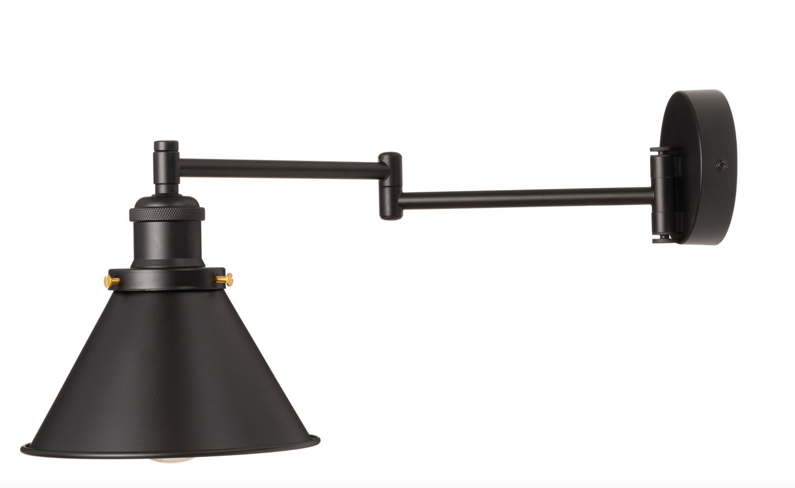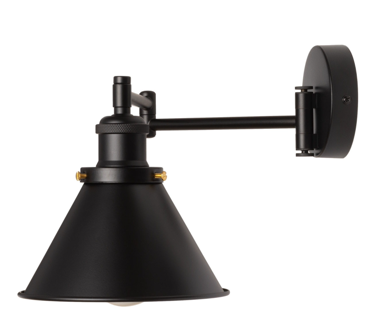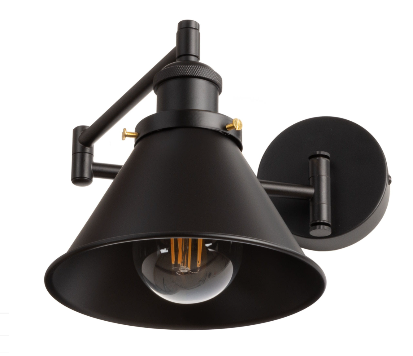 ,Kinkiet wykonano z wysokiej jakości metalu. Oprawa w mocnej matowej czerni sprawia że kinkiet znakomicie prezentuje się również w nowoczesnych wnętrzach. Dodatkowym atutem kinkietu jest możliwość ustawienia klosza pod różnym kątem. Regulacja motylkowa (góra dół), a także wysuwane ramię. . Minimalistyczna i surowa stylistyka oprawy z pewnością doskonale wkomponuje się w industrialne i loftowe wnętrza. Z taką oprawą będą także doskonale współgrać żarówki dekoracyjne.