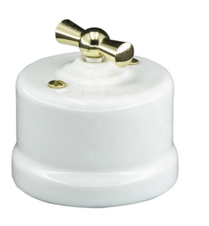 Włącznik ceramiczny obrotowy natynkowy krzyżowy biały ze złotym pokrętłem