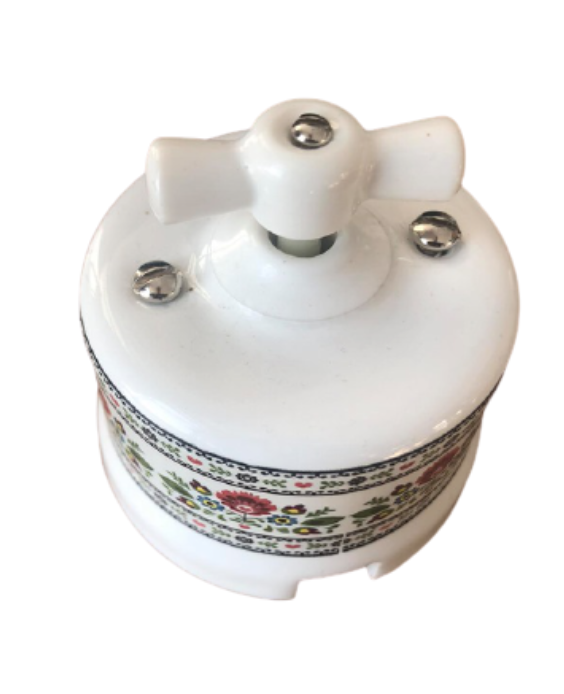 Włącznik ceramiczny obrotowy natynkowy krzyżowy biały ze zdobieniem FOLK