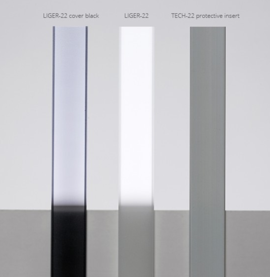 ,Osłona o powierzchni czarnej matowej, zmienia kolor na biały po zaświeceniu źródła światła, linia światła przy 120LED/m (9,6W/m) w profilach głębokości minimum 19 mm. Materiał osłony to PMMA odporny na UV. Przy wyłączonych LED przesłona jest czarna. Najlepszy efekt wizualny uzyskuje się w profilach, których wnętrze jest czarne. Linię światła można uzyskać z profilami Kluś: LIPOD, LOKOM, LARKO, LESTO, KOZEL, KOZUS, GIZA.
