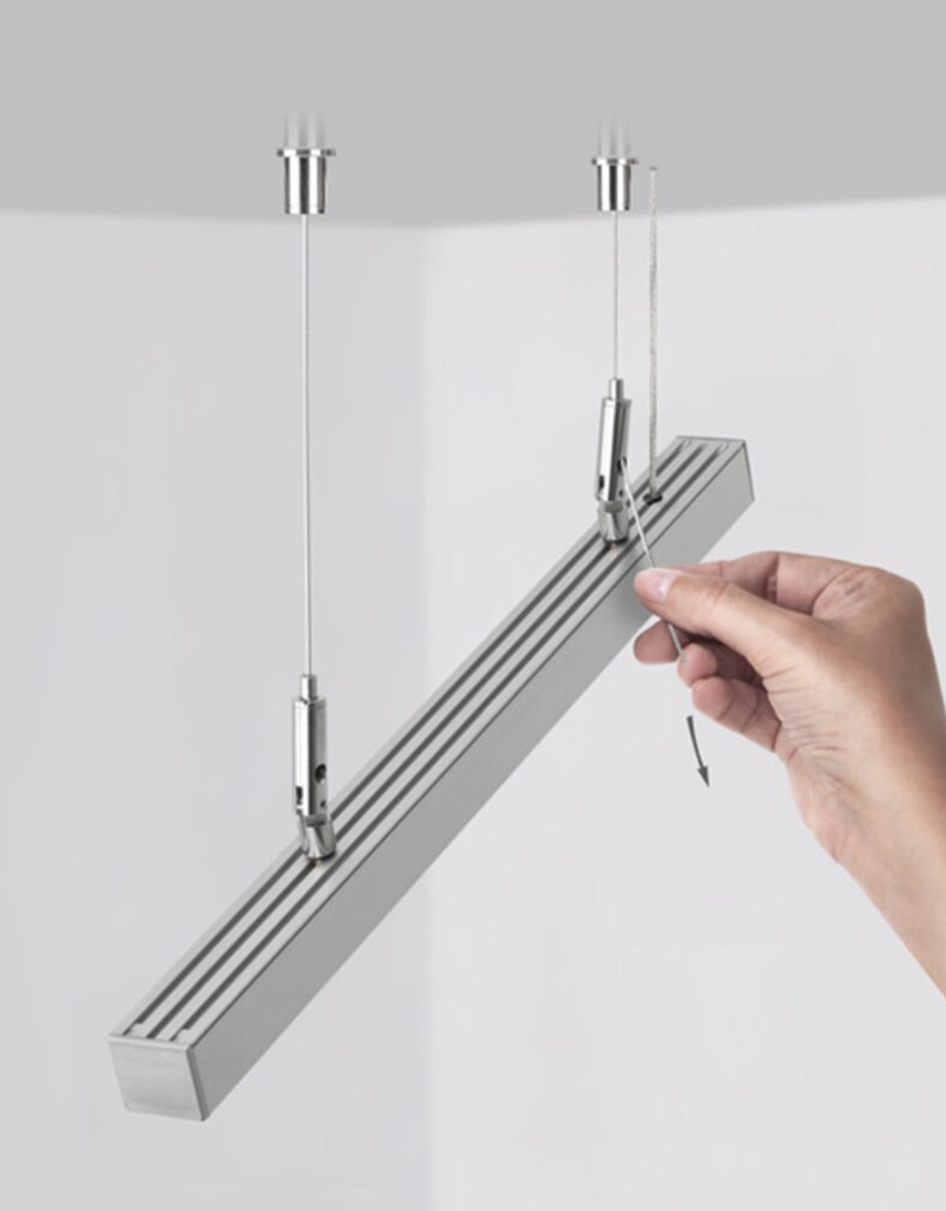 ,Przeznaczony do podwieszania liniowych opraw LED w pozycji pochylonej. Skompletowany zestaw elementów. Podwieszenie wzdłużne na lince oraz łatwa regulacja wysokości podwieszenia przy oprawie. Pochylenie oprawy poprzez regulację długości linek. Zawiera linkę o długości 1,5 m