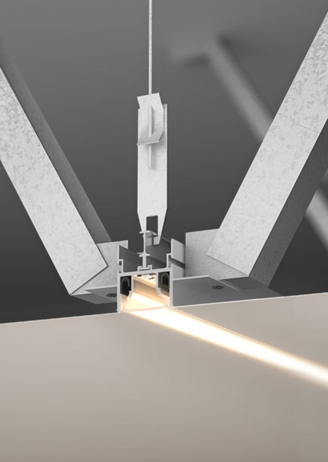 Profil można łączyć pod każdym kontem większym niż 60 stopni za pomocą dedykowanych łączników ZM. Montaż ułatwiają zawieszki FOLHAK oraz dostępne na rynku zawieszki do sufitów podwieszanych. Montaż : w podwieszeniu lub w zabudowie gipsowo-kartonowej, za pomocą dedykowanej listwy montażowej, dedykowanych akcesoriów i wkrętów. Możliwość łatwego łączenia w ciągi.