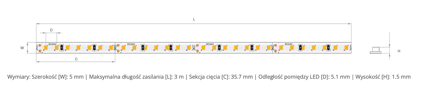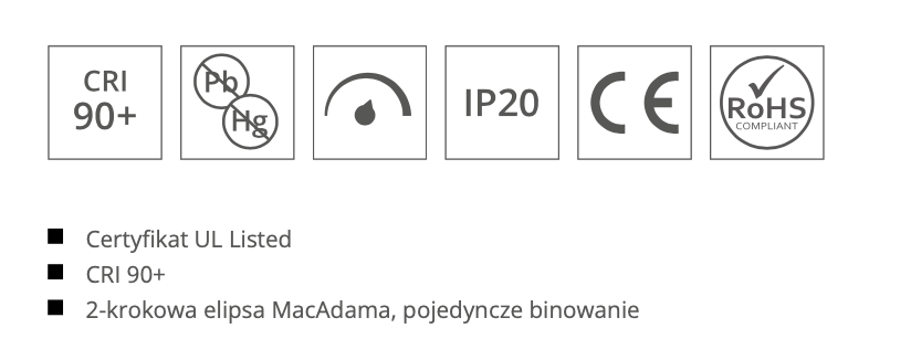 ,Ultracienka taśma LED 5mm technologii SMD. Dzięki bardzo dużej ilości diod, możliwe jest uzyskanie jednolitej linii świetlnej nawet przy niskich profilach aluminiowych. Certyfikat UL Listed, CRI 90+, 2-krokowa elipsa MacAdama, pojedyncze binowanie Zastosowanie: oświetlenie podwieszanych sufitów i zabudów z płyt GK reklamy oświetlenie witryn, gablot, wystaw, barów oświetlenie wnętrz, pokoi, korytarzy tuning samochodowy (wewnętrzny) oświetlenie obrysowe