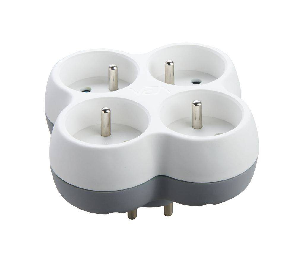 Praktyczny rozgałęźnik na cztery gniazda z uziemieniem, w kolorze białym, przeznaczony do użytkowania wewnątrz pomieszczeń.