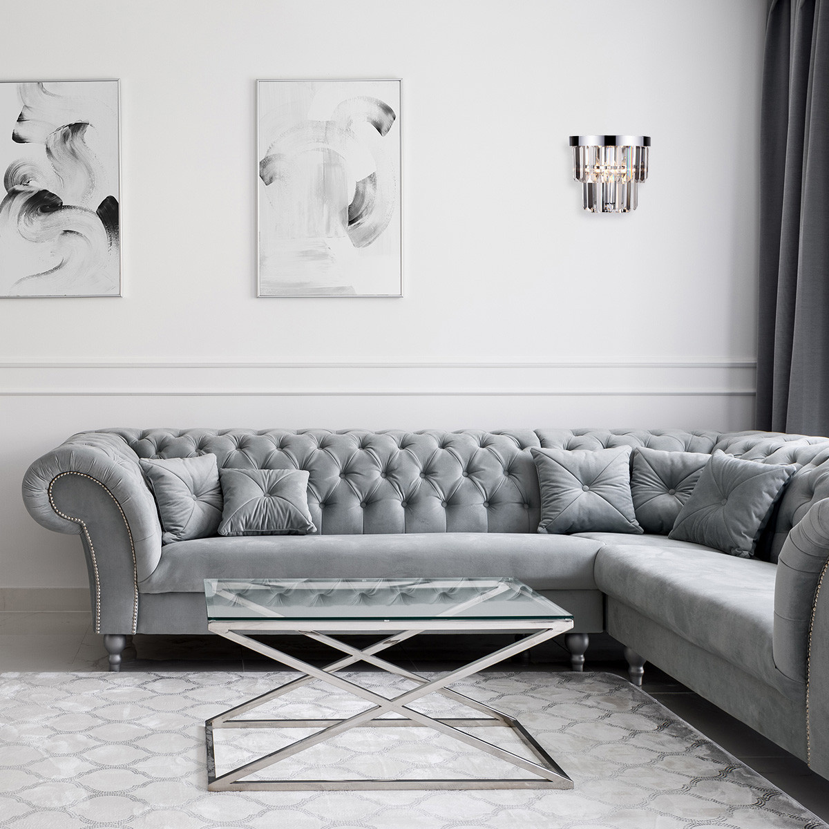 Materiał i kolorystyka: Kinkiet został wykonany z metalu w kolorze srebra oraz ozdobiony elementami szklanymi imitującymi kryształki, co nadaje mu luksusowego wyglądu.