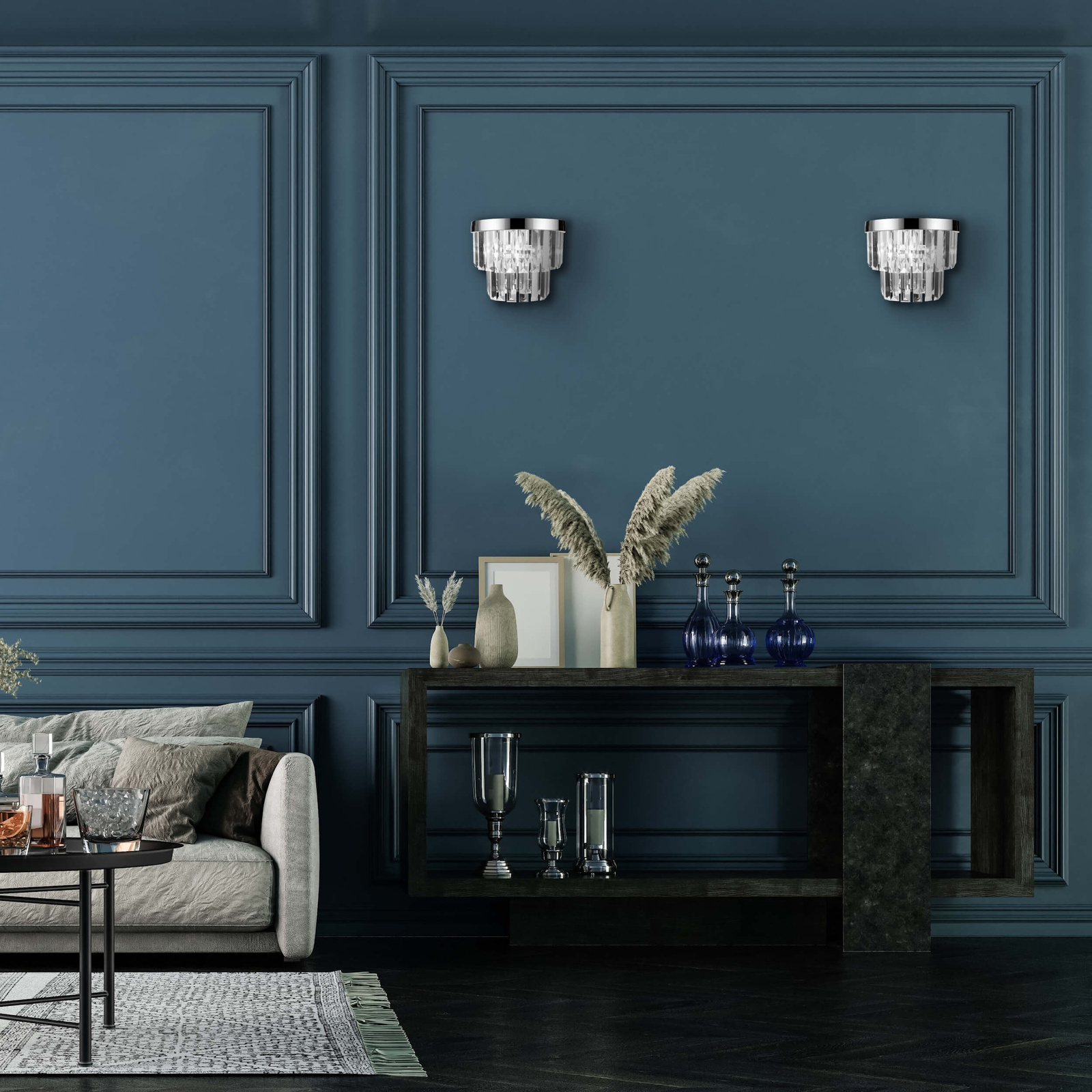 Vetro kinkiet - przedstawiamy państwu przepiękną, luksusową lampę. Ten szklisty, transparentny klosz, którego elementy przypominają strugi deszczu, jest pięknie wbudowany w metalowy stelaż. Ten modny design, posiada jedno źródło światła, które pięknie mieni się wśród szklanych elementów klosza. Niewątpliwie, posiadaniem takiego modelu powinni zainteresować się miłośnicy nowoczesnych wnętrz. Transparentność sprawia, że lampa ta uszlachetni niejedno pomieszczenie. Z pewnością, dzięki bogatemu wyglądowi, odnajdzie się także w komercyjnych miejscach, takich jak: pałacowe sale weselne czy muzea.