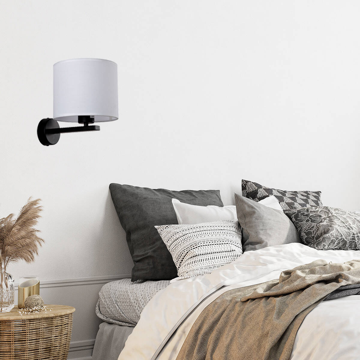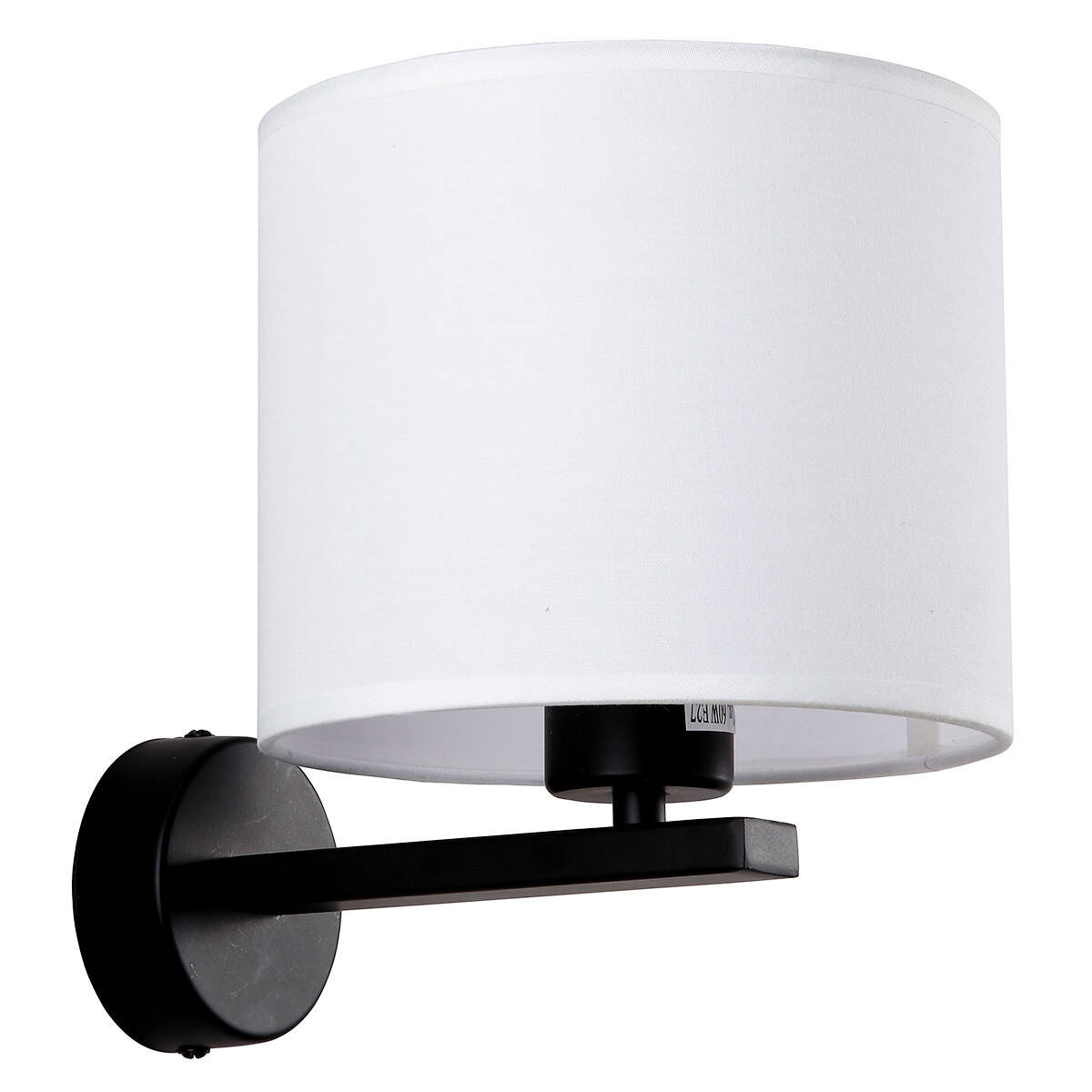 Rodzaj lampy: Kinkiet z kolekcji Cecina. Wymiary: Kinkiet posiada 25 cm wysokości, natomiast głębokość lampy wynosi 18 cm. Materiał i kolorystyka: Kinkiet wykonany jest metalu w czarnym kolorze. Klosz lampy został wykonany z białej tkaniny. Źródło światła: Kinkiet przeznaczony jest na jedną żarówkę o gwincie E27.