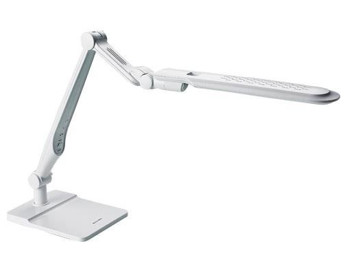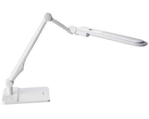 ,Lampka biurkowa led o mocy 10W. Posiada możliwość pracy w trzech trybach barwy światła: ciepła 3000K, neutralna dzienna 4000K i biała zimna 6000K. Dodatkowo na każdym trybie możemy płynnie zmieniać natężenie światła. Lampka charakteryzuje się bardzo ciekawym designem, a jej dużą zaletą jest możliwość regulacji skrętu na wielu płaszczyznach. Lampka w podstawowej wersji sprzedawana jest na podstawie, dodatkowo w komplecie zacisk do blatu, dzięki czemu można ją zamontować bezpośrednio do blatu biurka zyskując dodatkową przestrzeń na biurku. Dostępne są następujące opcje kolorystyczne: czarna, biała i biało - srebrna.