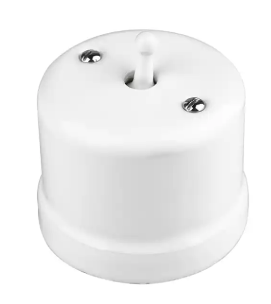 ,Elegancki włącznik dzwonkowy Toggle ceramiczny. Montaż: natynkowy. Prezentowany włącznik jest sprzedawany bez ramki - co pozwala na samodzielne skomponowanie zestawu pojedynczego, podwójnego a nawet potrójnego ( ramkę drewnianą bądź ceramiczną można dokupić.) Kolor: biały.