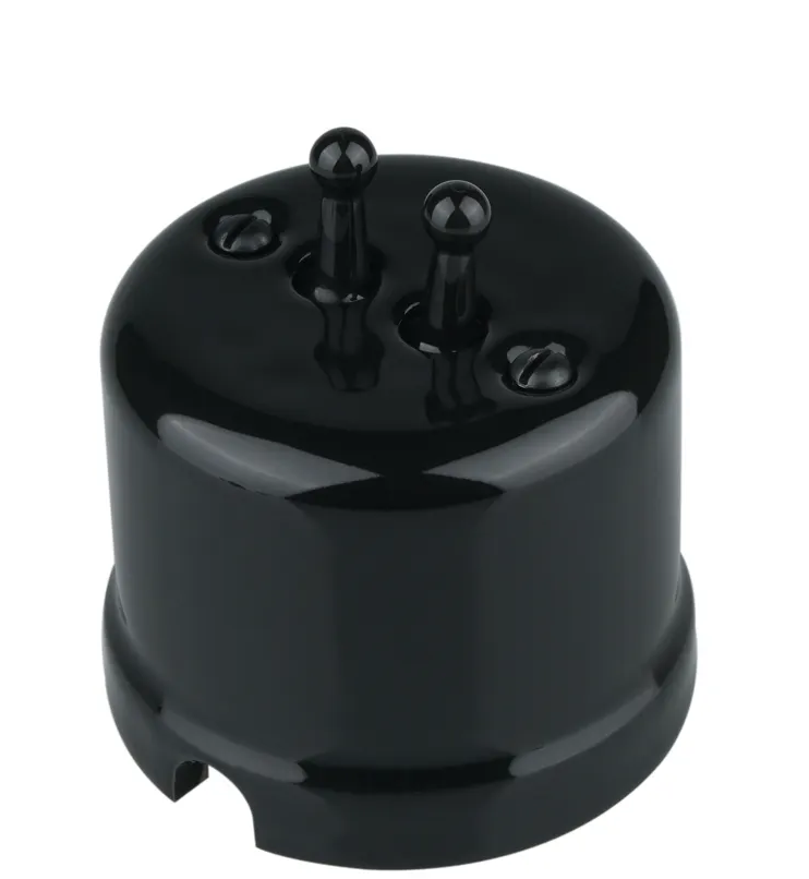,Elegancki włącznik podwójny ceramiczny. Montaż: natynkowy. Prezentowany włącznikjest sprzedawany bez ramki - co pozwala na samodzielne skomponowanie zestawu pojedynczego, podwójnego a nawet potrójnego ( ramkę drewnianą bądź ceramiczną można dokupić.) Kolor: czarny.