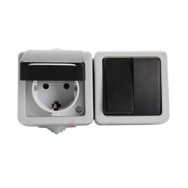 Włącznik podwójny natynkowy z gniazdem zasilającym TEKNO IP54 szary