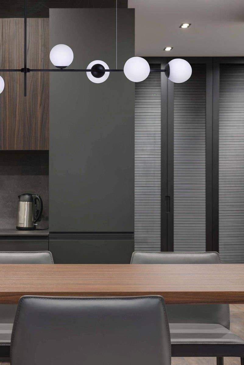 Ta propozycja idealnie sprawdzi się nad wyspą kuchenną bądź stołem w jadalni. Dzięki poprzecznej budowie podkreśli wydłużone blaty i odpowiednio je doświetli. Swoją nienachalną formą nie przytłoczy aranżacji wnętrza, ale dopełni ją, tworząc ciekawy efekt w pomieszczeniu. Pięć źródeł światła zostało umieszczonych na podłużnym ramieniu i skierowanych w różnych kierunkach. W projekcie zastosowano uniwersalne gwinty E27, do których bez problemu dopasujesz odpowiadające Ci żarówki pod względem barwy oraz mocy (max. 40W). Pamiętaj, że w zależności od temperatury barwowej żarówki, kolor kloszy będzie zmieniał swoje tony. Przy zastosowaniu żarówek o ciepłej barwie będą to żółtopomarańczowe tony, natomiast o zimnej - niebieskawe.
