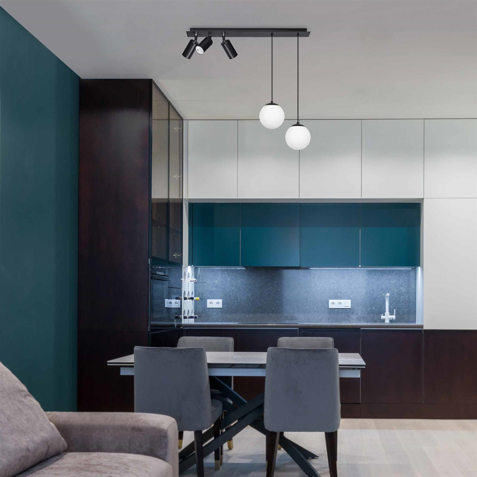 Aż pięć punktów światła umieściliśmy na dwóch końcach podłużnej podsufitki. Po jednej stronie mamy trzy reflektory z gwintem GU10, a po drugiej dwa zwisy o regulowanej długości (max. 85 cm) zakończone trzonkiem E14. Lampa posiada możliwość podziału na dwa włączniki (3+2).