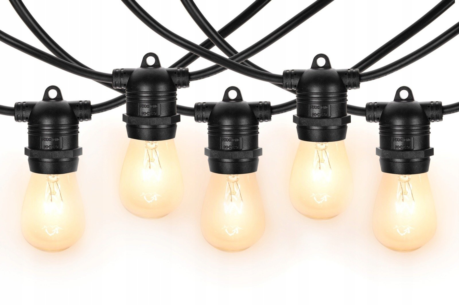 ,Girlandy świetlne to dekoracja która ma wiele zastosowań. Można nimi ozdobić lokale gastronomiczne, hotele, ogrody, altany itp. Doskonale nadają się jako ozdoba na różnego rodzaju uroczystości w plenerze. Girlanda posiada 10 oprawek E27 o całkowitej długości 10m - oprawki rozmieszczone co 98cm. Na końcu girlandy znajduje się gniazdo umożliwiające podłączenie kolejnej. Maksymalnie można podłączyć do 10 sztuk. Girlanda sprzedawana bez źródła światła - nasza rekomendacja - żarówka dekoracyjna LED.
