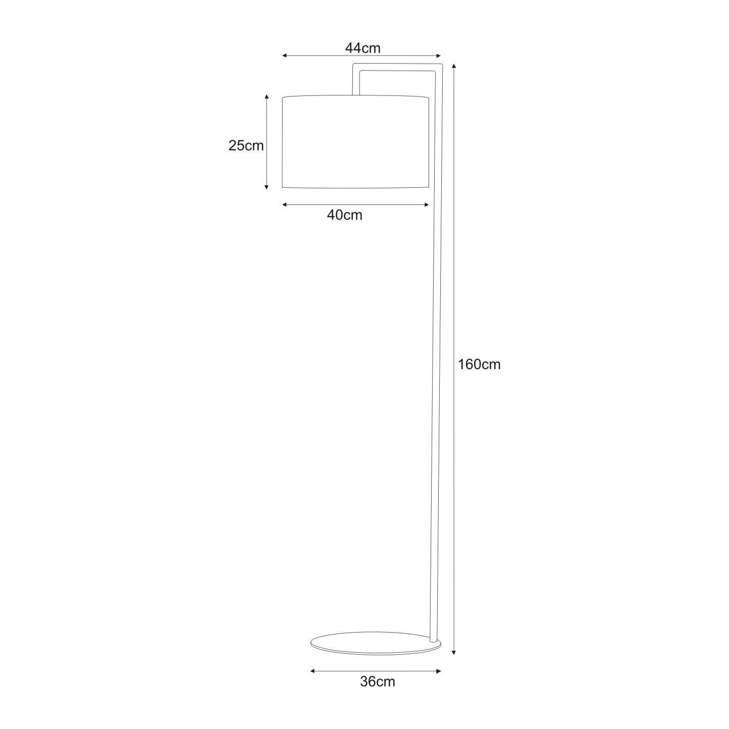 Choć całkiem wysoka (160 cm), jest bardzo ustawna, gdyż wcale nie zajmuje tak wiele miejsca. Umieszczona na płaskiej podstawie w kształcie koła wychodzi ku górze trzonem, aby zgiąć się w dwóch miejscach pod kątem prostym. Na jej zakończeniu spoczywa abażur w kształcie szerokiego, pustego w środku walca. Klosz mierzy 25 x 40 cm - umieszczony został blisko trzonu, dlatego całość konstrukcji zajmuje na szerokość jedynie 44 cm. Dzięki takim wymiarom i budowie, lampa znajdzie swoje zastosowanie w kącie pomieszczenia, obok Twojego ulubionego fotelu do czytania czy doniczek z wysokimi roślinami.