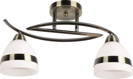 Dwupunktowa lampa sufitowa z serii COLAR jest połączeniem nowoczesnego kształtu z ponadczasową kolorystyką. Armatura w całości zachowana w kolorze patyny nadaje lampie elegancji. Ten odcień nazywany jest inaczej antycznym złotem, który nigdy nie wychodzi z mody. Klosze lampy pokryte są matową, białą powłoką, która sprawia, że emitowane wiązki światła są wyłapywane i delikatnie tłumione, dzięki czemu oświetlenie staje się przyjemniejsze w odbiorze i przytulniej oświetla pomieszczenie. Ten model posiada miejsce na żarówki z małym gwintem E14, które pozwalają na dobranie dowolnej barwy i jasności światła do indywidualnych referencji użytkownika. Takie rozwiązanie zwiększa też funkcjonalność lampy. Gdy któraś żarówka się przepali, wystarczy ją wymienić, bez konieczności zmiany całej lampy.