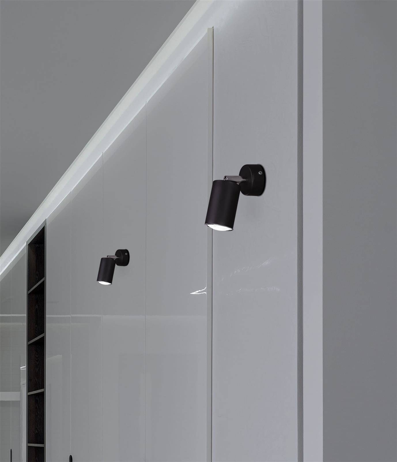 Pojedynczy punkt światła otoczono elegancką, czarną osłonką i przymocowano do okrągłej, niedużej podsufitki. Można nim manewrować na różne strony, aby dać światło na konkretny element w pokoju, albo skierować go bezpośrednio na ścianę, by odbijało się ono rozjaśniając przestrzeń pomieszczenia.