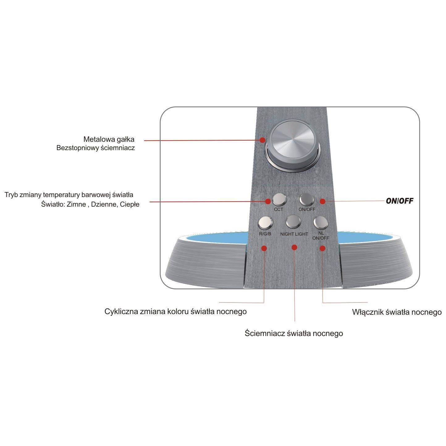 Lampka biurkowa K-BL1063 zapewnia użytkownikowi szereg udogodnień, które z pewnością poprawią naszą efektywność w pracy. Zapewnia ona między innymi: wbudowane gniazdo USB, trzystopniową regulację temperatury barwowej światła, tryb nocny oraz dodatkowe nocne oświetlenie podstawy z cykliczną zmianą koloru. Dodatkowo, model ten wyposażony jest w bezstopniowy ściemniacz, który regulujemy za pomocą stylowego pokrętła. Wszystko to zamknięte jest w nowoczesnej oprawie, która zadowoli nawet najbardziej wymagających klientów. Lampka z serii BERKANE utrzymana jest w odcieniach szarości i srebra, a dodatkowy efekt zapewnia obudowa imitująca szczotkowaną stal, przez co całość nabiera nieco surowego, minimalistycznego stylu.