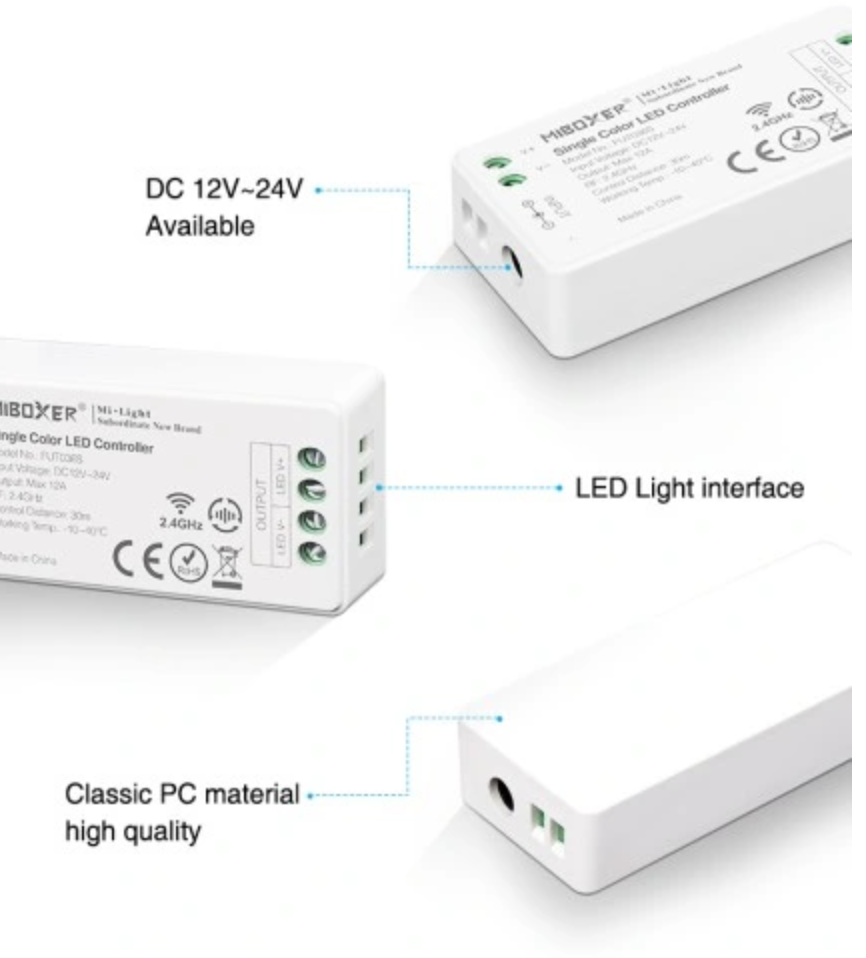 Kontroler-ściemniacz podłączony do taśmy LED pozwoli nam na jej włączanie i wyłączanie, możliwa jest również zmiana intensywności świecenia (rozjaśnianie/przyciemnianie), wszystko to możemy sterować zdalnie za pomocą pilota* 2,4 GHz komunikacja radiowa - kontroler komunikuje sie pilotem* za pomocą fal radiowych o częstotliwości 2400-2485 MHz. Jest to wyższe pasmo fal radiowych niż te stosowane u standardowych kontrolerów komunikujących się z pilotami* radiowo. Starszy typ komunikacji radiowej stosowany w kontrolerach był na paśmie ok 430 MHz, nowy kontroler pracuje na taśmie 2,4GHZ co jest dużą zaletą. Pasmo 2,4GHZ posiada wiele zalet, takich jak: znacznie większy zasięg, ok 30m w pomieszczeniu i 50m na wolnej przestrzeni większa szybkość komunikacji, polecenia z pilota* docierają szybciej, są wyraźniejsze przeze co są lepiej odczytywane przez kontroler, zjawisko braku reakcji czy konieczność powtarzania polecenia jest znacznie zmniejszone. możliwość podłączenia specjalnego adaptera WiFi i kontrola systemu oświetlenia za pomocą telefonu-smartphona lub tabletu *pilot do dokupienia osobno na pozostałych naszych aukcjach » Prawidłowe podlączenie taśmy do zasilacza/kontrolera Przy długości taśmy większej niż 10mb (np. 12-15-20mb) występuje spadek napięcia na ostatnich metrach (to naturalna rzecz wynikająca z oporu jaki stawia taśma). By uzyskać jednakową ilość światła na wszystkich metrach taśmy trzeba ją odpowiednio podłączyć. 1 sposób: taśmę dzielimy na 2 takie same odcinki (np. po 7,5 mb w przypadku 15mb tasmy) i podłączamy ją równolegle do zasilacza/kontrolera to najlepszy sposób. 2 sposób: taśmę podłączamy szeregowo (jeden długi odcinek - nie dłuższy niż 15mb) do zasilacza/kontrolera i dodatkowo podajemy napięcie na koniec taśmy tzn. podłączamy początek i koniec taśmy do napięcia 12V - z tego samego kontrolera/zasilacza, ma to za zadanie wzmocnić napięcie na końcu taśmy. 3 sposób: jeżeli kontroler ma za małą moc do obsłużenia całej dłogości tąsmy lub wystepuje ryzyko spadku napięcia na taśmie (taśma świeci słabiej) to trzeba zastosować drugi kontroler-ściemniacz np. łączna długość taśmy to 40mb: taśmę dzielimy na 3 odcinki po 10mb, 3 odcinki podłączamy równolegle do kontroera, a 4 odcinek podłączmamy do 2 kontrolera-ściemniacza. obydwa kontrolery parujemy z pilotem, dzięki temu mozemy sterować obydwoma kontrolerami na raz, a co za tym idzie całą taśma, przy dłuższych odcinkach postępujemy analogicznie.
