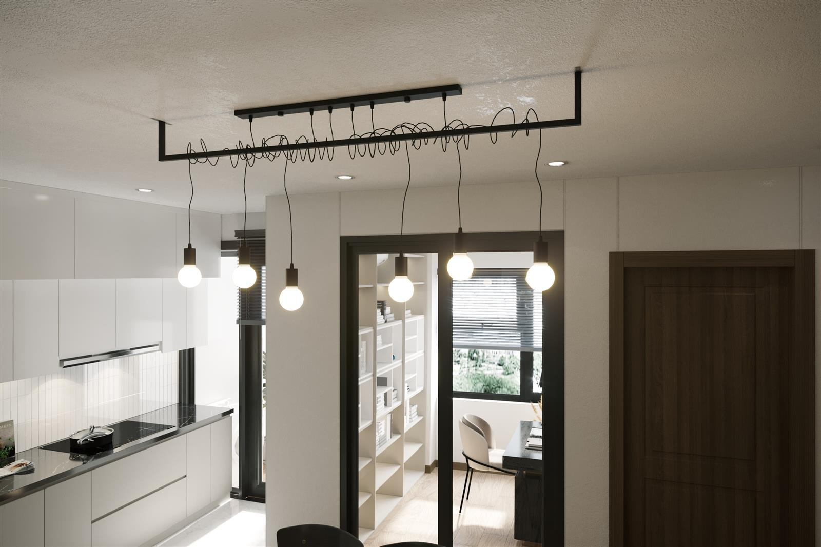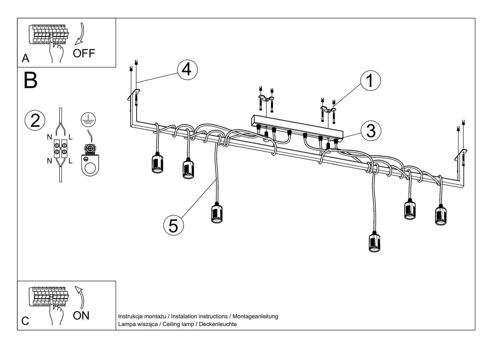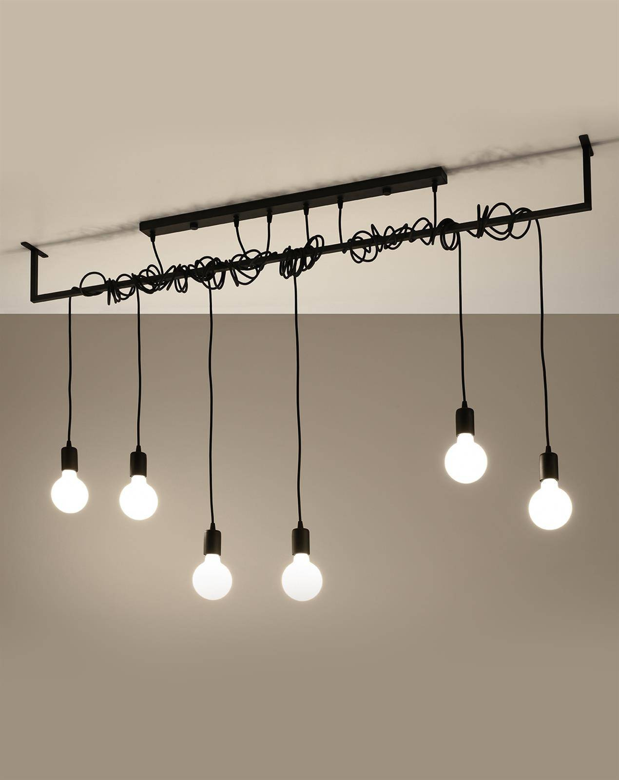 - Źródło światła: E27, 6x60W, 6x15W LED, 50-60Hz, ~220-230V, IP20, klasa ochronności I Źródło światła nie jest w komplecie. Wymiary: 150/10/150 cm [max. długość zawiesia 3 m]Materiał: tkanina, stal Kolor: czarny