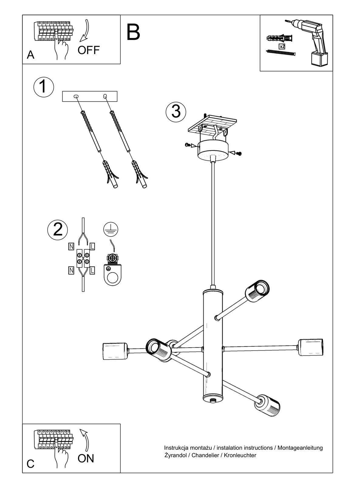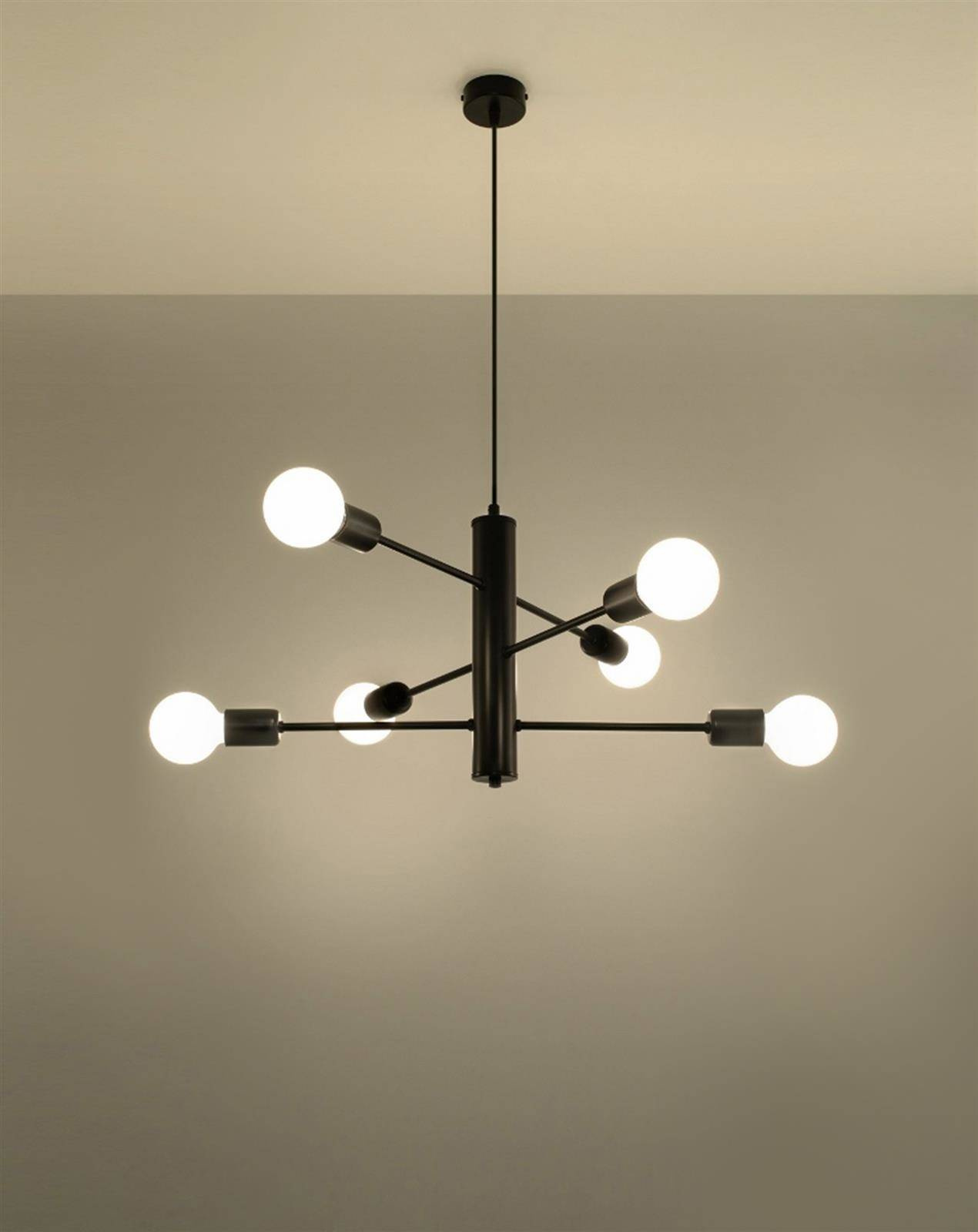 - Źródło światła: E27, 6x60W, 6x15W LED, 50-60Hz, ~220-230V, IP20, klasa ochronności IŹródło światła nie jest w komplecie.Wymiary: 60/60/85 cmMateriał: stal Kolor: czarny