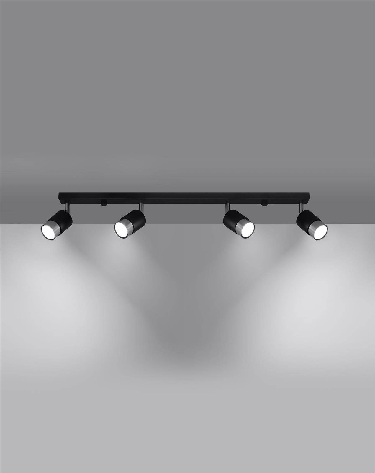 - Źródło światła: GU10, 4x40W, 4x12W LED, 50-60Hz, ~220-230V, IP20, klasa ochronności IŹródło światła nie jest w komplecie.Wymiary: 81/5/18 cmMateriał: stalKolor: czarny/chrom