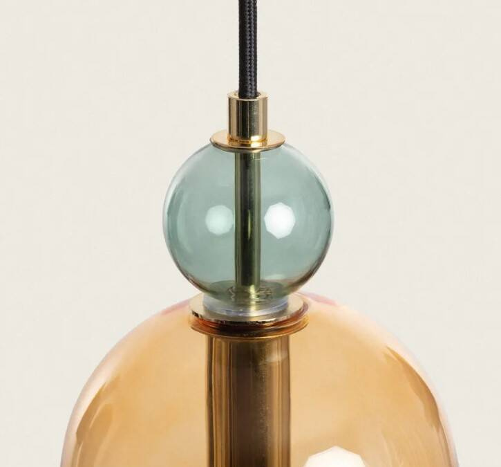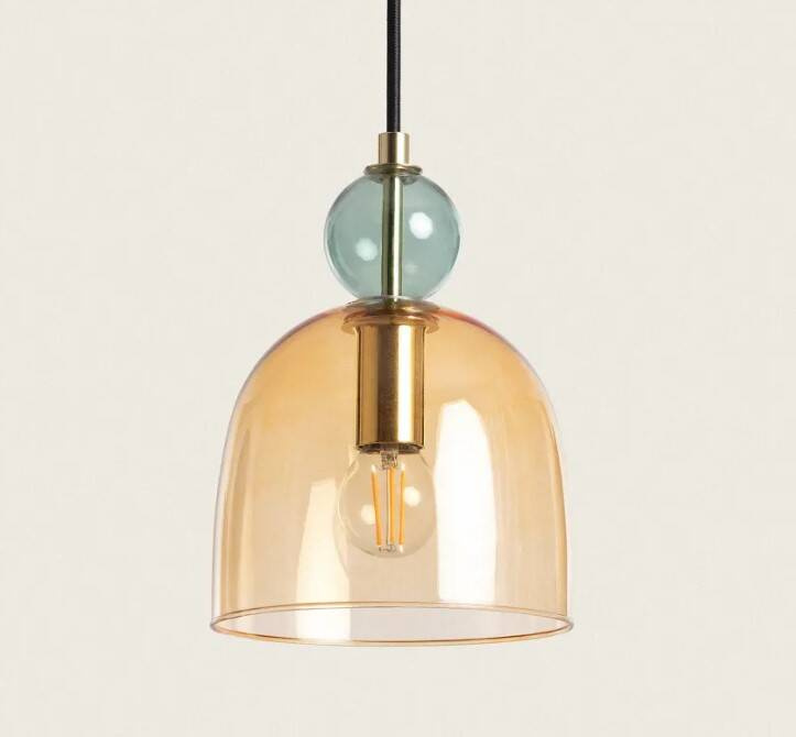 Lampa Wisząca z Metalu i Szkła Mono-Baudelaire łączy wyjątkowy i elegancki design z najwyższej jakości wykończeniami. Ta lampa wnosi odrobinę koloru i osobowości do wybranej przestrzeni. Lampa Wisząca z Metalu i Szkła Mono-Baudelaire doskonale sprawdzi się w przestrzeniach utrzymanych w stylu vintage. Jej klosz składa się z kolorowej szklanej kuli, za którą znajduje się klosz w kształcie kopuły, wykonany ze szkła i wykończony w innym kolorze niż górna kula. Jego projekt kończy się dopasowaną oprawką lampy i rozetą w kolorze złotym i chromowanym wykończeniu. To, jakie światło emituje ta lampa, będzie uzależnione od wybranej przez nas żarówki E14. W ten sposób możemy wybrać światło ciepłe, zimne lub neutralne w zależności od otoczenia, jakie chcemy stworzyć. Ciekawą opcją jest wybór niektórych żarówek RGB lub CCT, które dadzą nam plus uniwersalności w oświetlaniu przestrzeni, czy to w domu, czy w lokalu użytkowym. Jest szeroko stosowana w tak różnych miejscach, jak jadalnie, sypialnie, kuchnie, biura, salony, restauracje, kawiarnie itp.