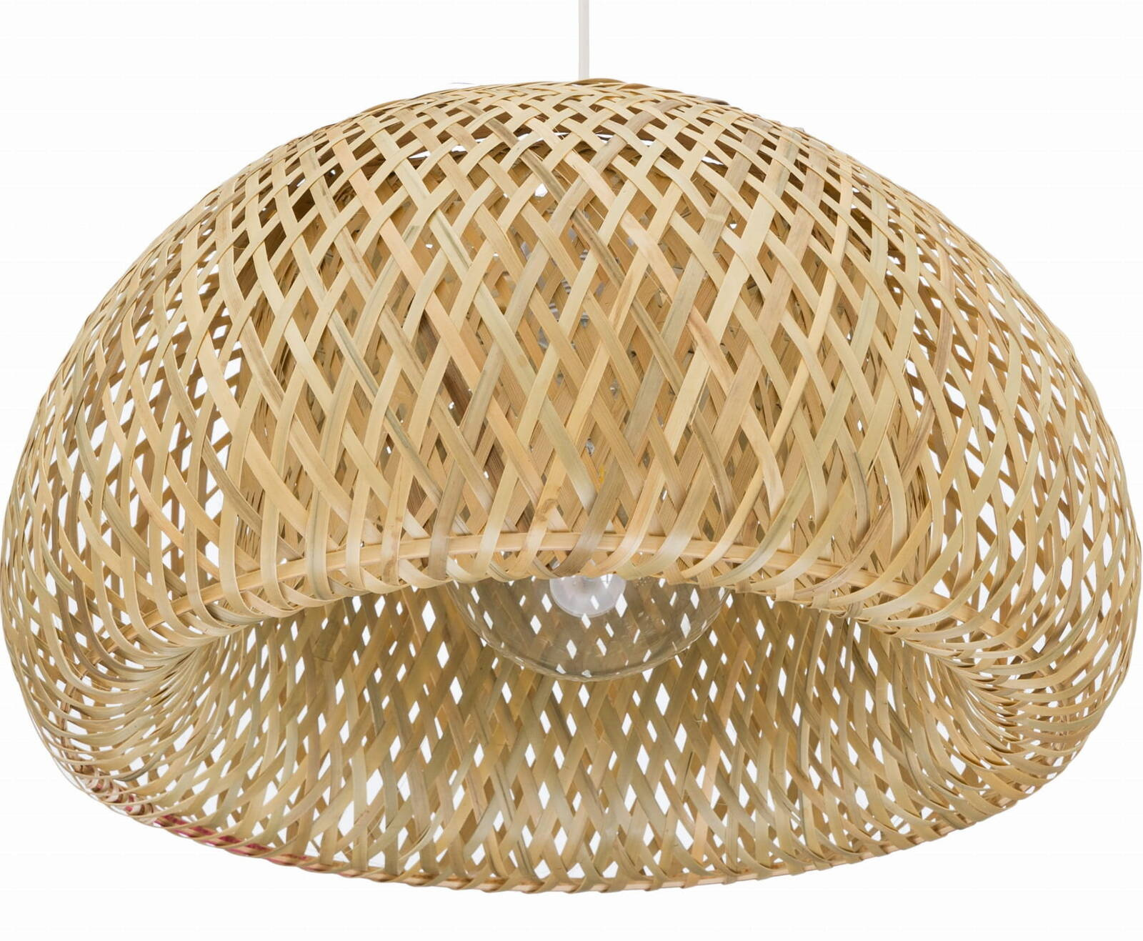 Klosz lampy został ręcznie wykonany z drewna bambusowego. Plecionka w zaokrąglonej formie wywija się ku dołowi a podwójny splot sprawia że światło jeszcze piękniej przenika przez ażurową formę klosza. Lampa ma kształt kopuły.
