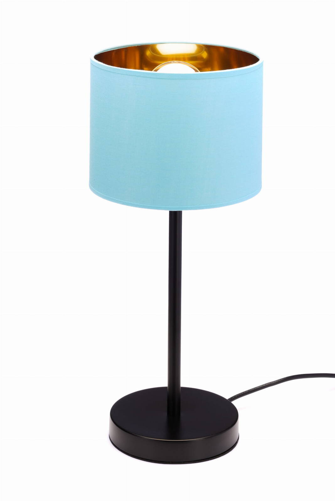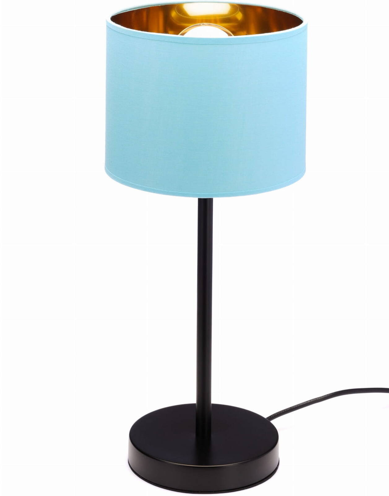 Lampka z niebieskim abażurem w złotym kolorze od wewnątrz, wyposażona w kabel z włącznikiem ON/OFF o długości 140cm.