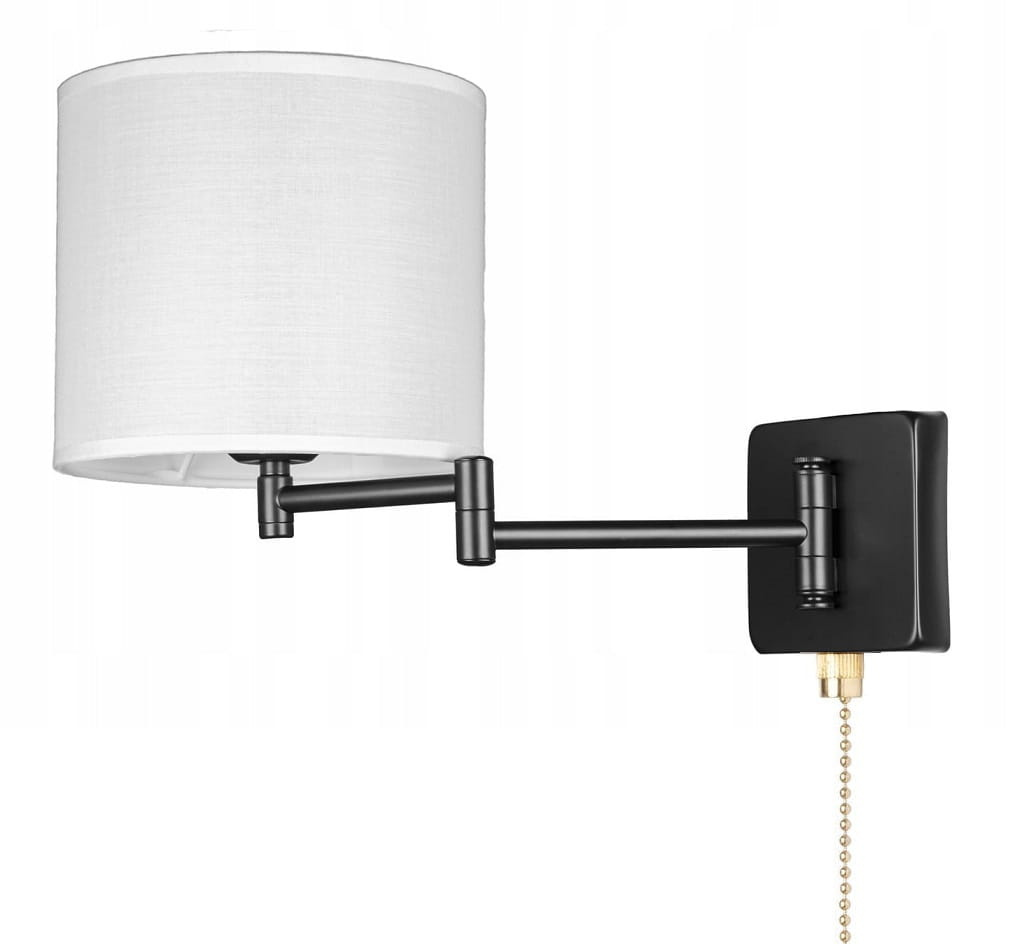 Kinkiet regulowany z białym abażurem czarny hotelowy z łańcuszkiem