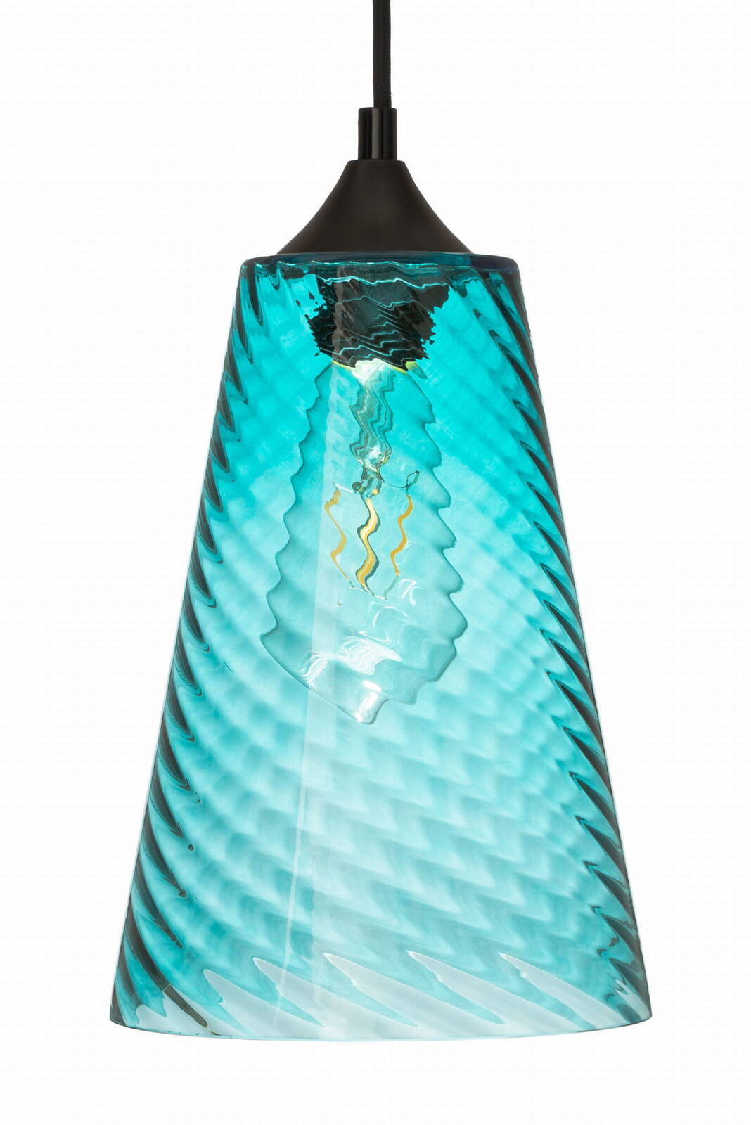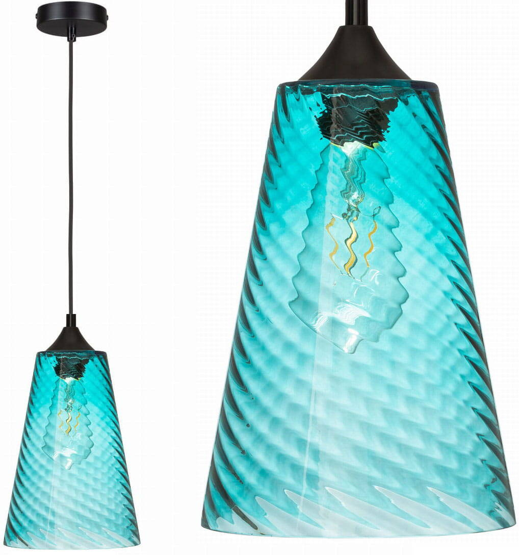 Lampa wisząca niebieska stożek o niebieskim wybarwieniu szklanego klosza należy do oryginalnej serii VELA. Lampa posiada falistą strukturę szkła.