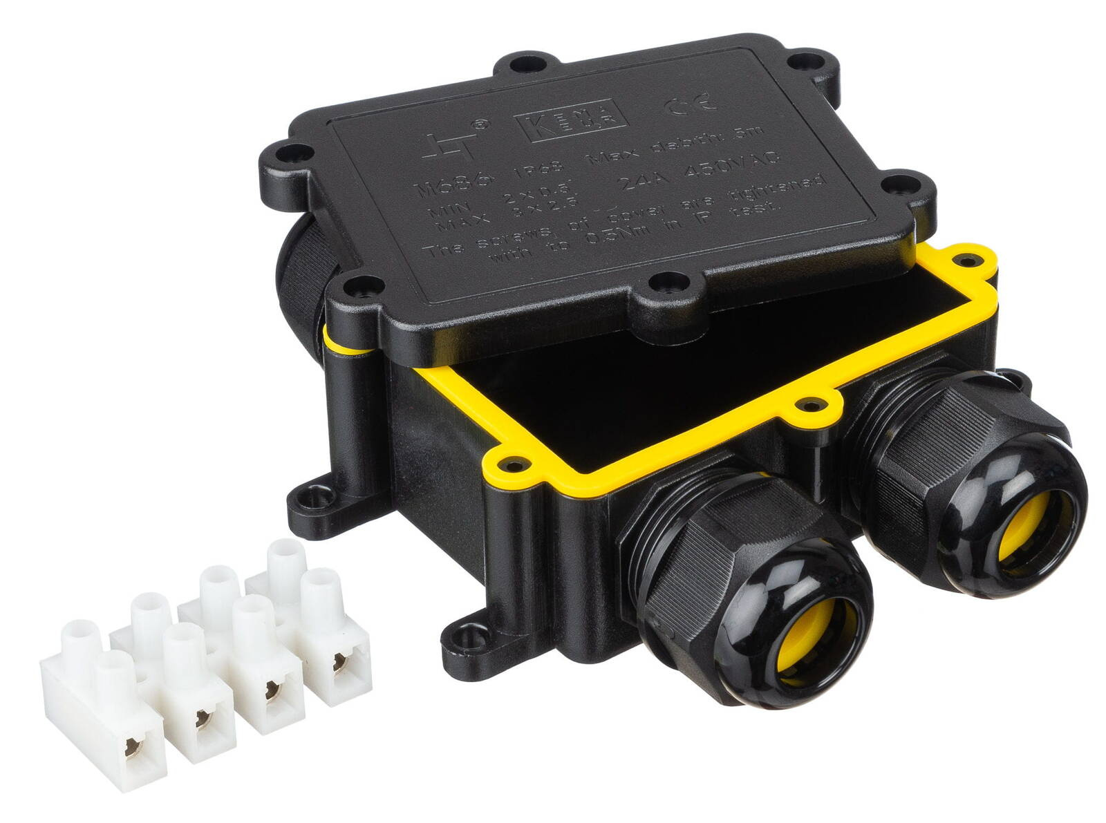 Hermetyczna puszka kablowa ułatwia montaż zewnętrznych lamp LED oraz szczelne łączenie czterech przewodów ziemnych. Skręcane elementy z uszczelkami zaciskają się na kablu - klasa szczelności IP68. Średnica przewodu od 8 do 12 mm, wewnątrz puszki kostka elektryczna 4,5mm x 2,5 mm. Obudowa koloru czarnego wykonana z polipropylenu.