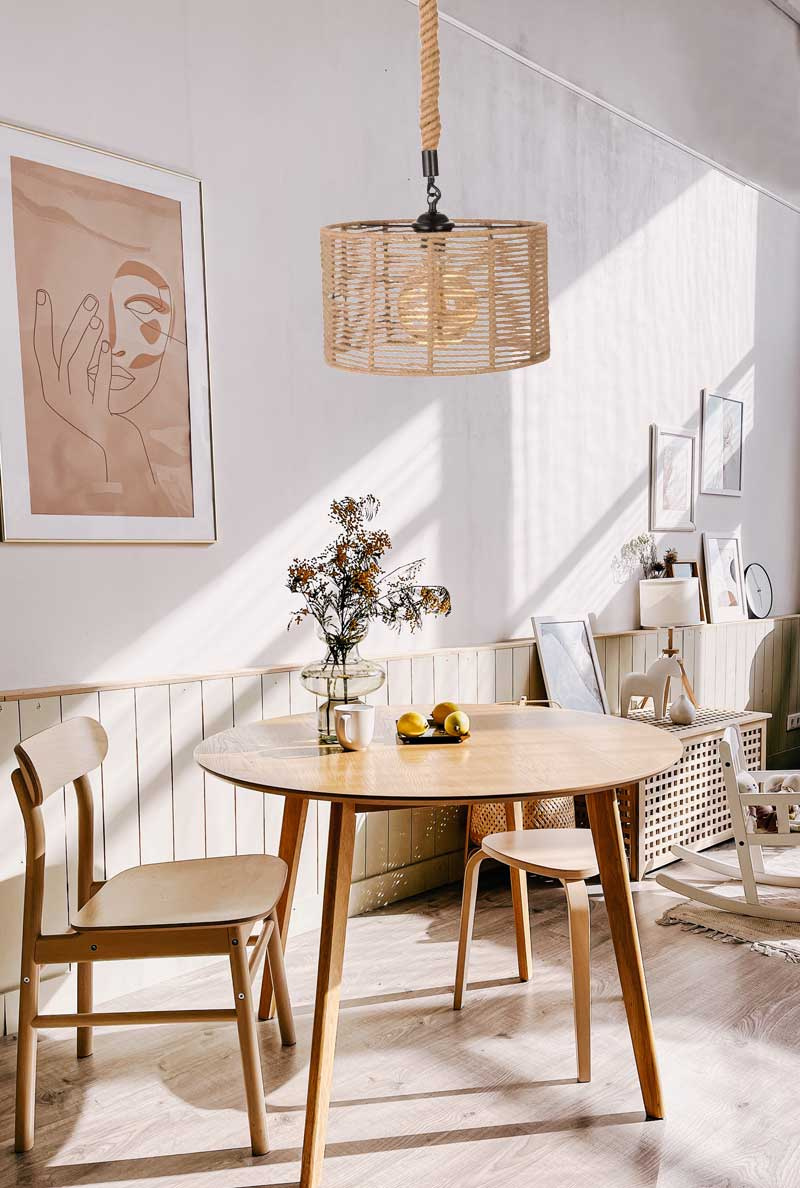 EKO DESIGN - klosz lampy opleciony jutowym sznurkiem nadającym lampie eko design. Wystarczy dobrać dekoracyjne źródło światła a lampa rozświetli wnętrze i nada nowy charakter. Lampa w stylu boho świetnie komponuje się we wnętrzach inspirowanych naturą. Przepięknie prezentuje się na tle drewna szarości i ceramiki. Ociepli wizualnie wnętrze Pasuje do kuchni i salonu ale także do sypialni czy pokoju dziecięcego.