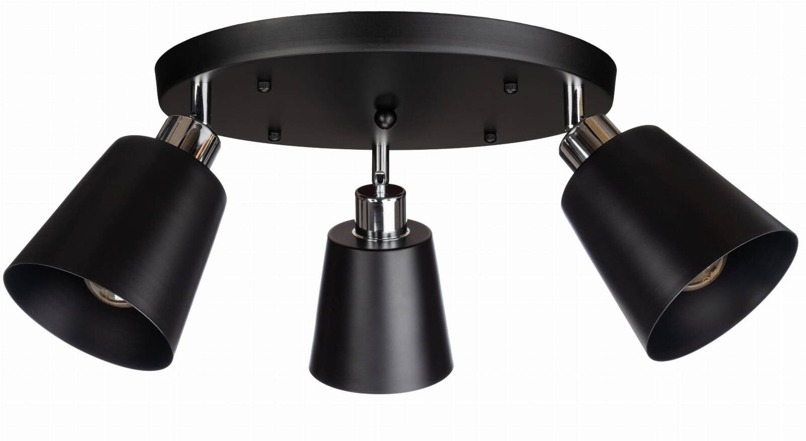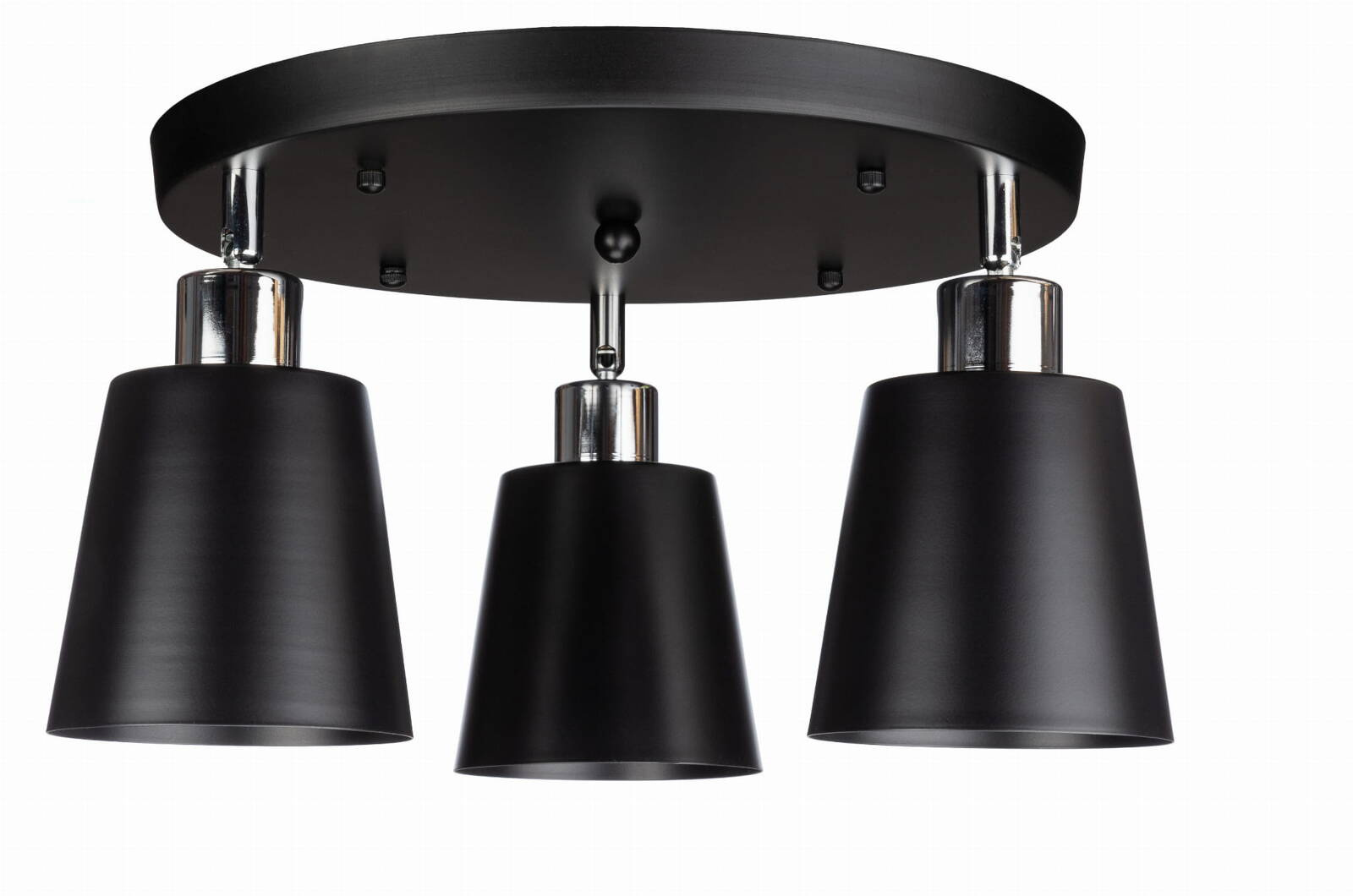 Lampa typu plafon potrójna z metalowymi kloszami w kształcie stożków. Lampa posiada chromowane uchwyty dzięki którym posiada możliwość regulacji nachylenia każdego z kloszy. Lampa świetnie pasuje do nowoczesnych wnętrz. Klosz lampy stanowi wymienny element przez co daje nieograniczone możliwości aranżacyjne na przyszłość.