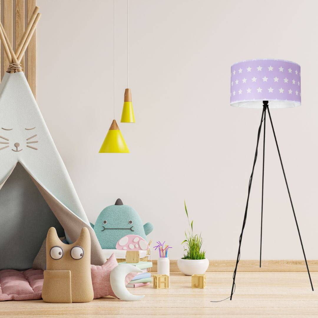 Lampa stojąca trójnóg black Neptun to piękna lampa o metalowym stelażu z różowym abażurem z dekoracyjnymi gwiazdkami wykonanym z tkaniny premium. Ta wysoka lampa świetnie sprawdzi się w salonie przy sofie w sypialni a nawet pokoju dziecięcym. Lampę polecamy również do biura czy restauracji.