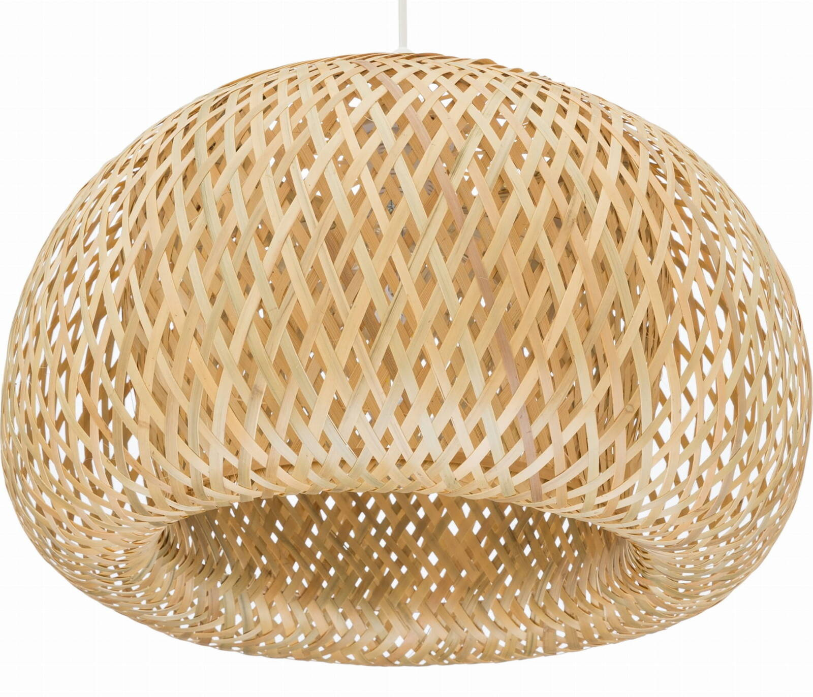 Klosz lampy został ręcznie wykonany z drewna bambusowego. Plecionka w zaokrąglonej formie wywija się ku dołowi a podwójny splot sprawia że światło jeszcze piękniej przenika przez ażurową formę klosza.