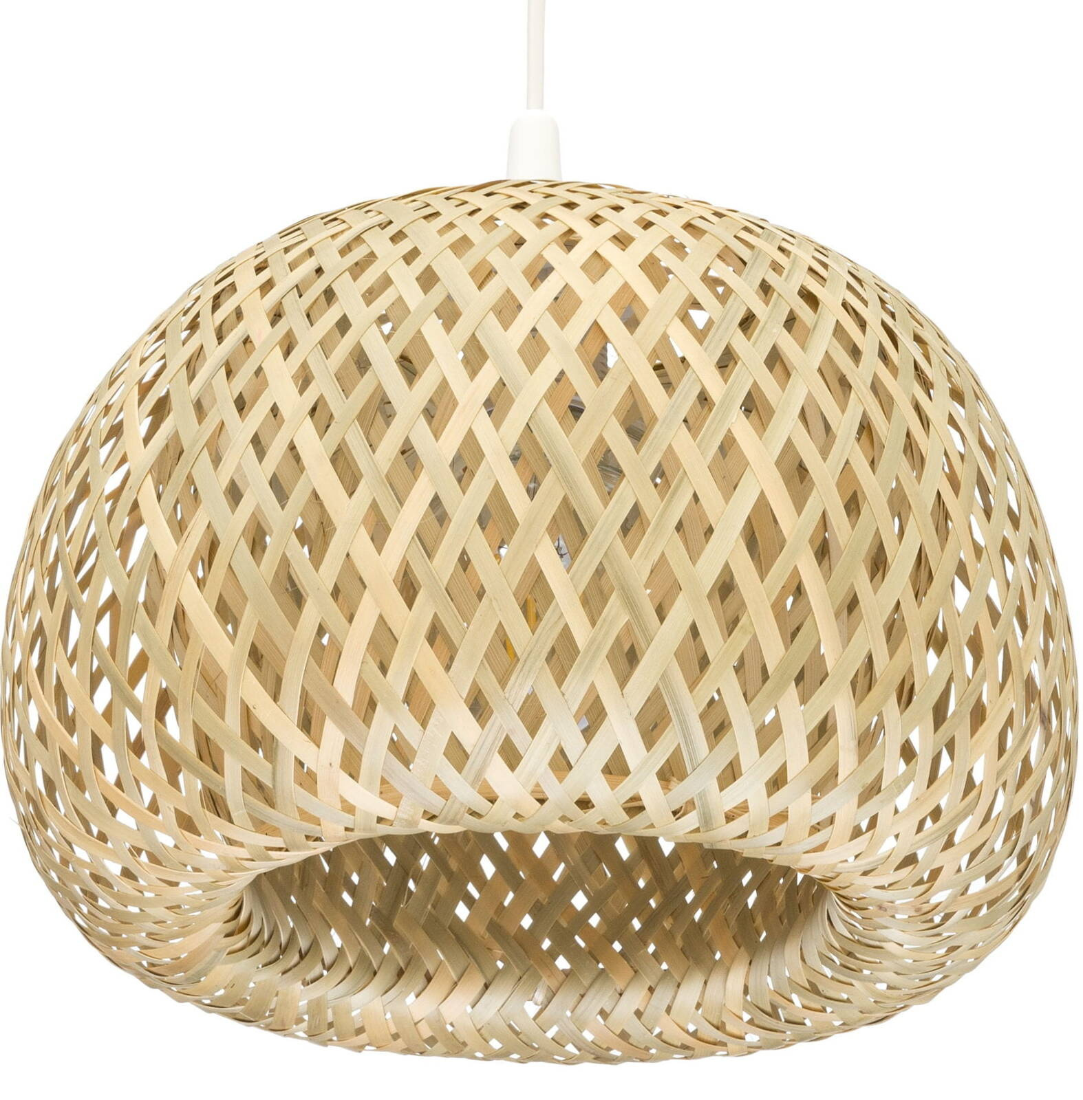 Klosz lampy został ręcznie wykonany z drewna bambusowego. Plecionka w zaokrąglonej formie wywija się ku dołowi a podwójny splot sprawia że światło jeszcze piękniej przenika przez ażurową formę klosza.