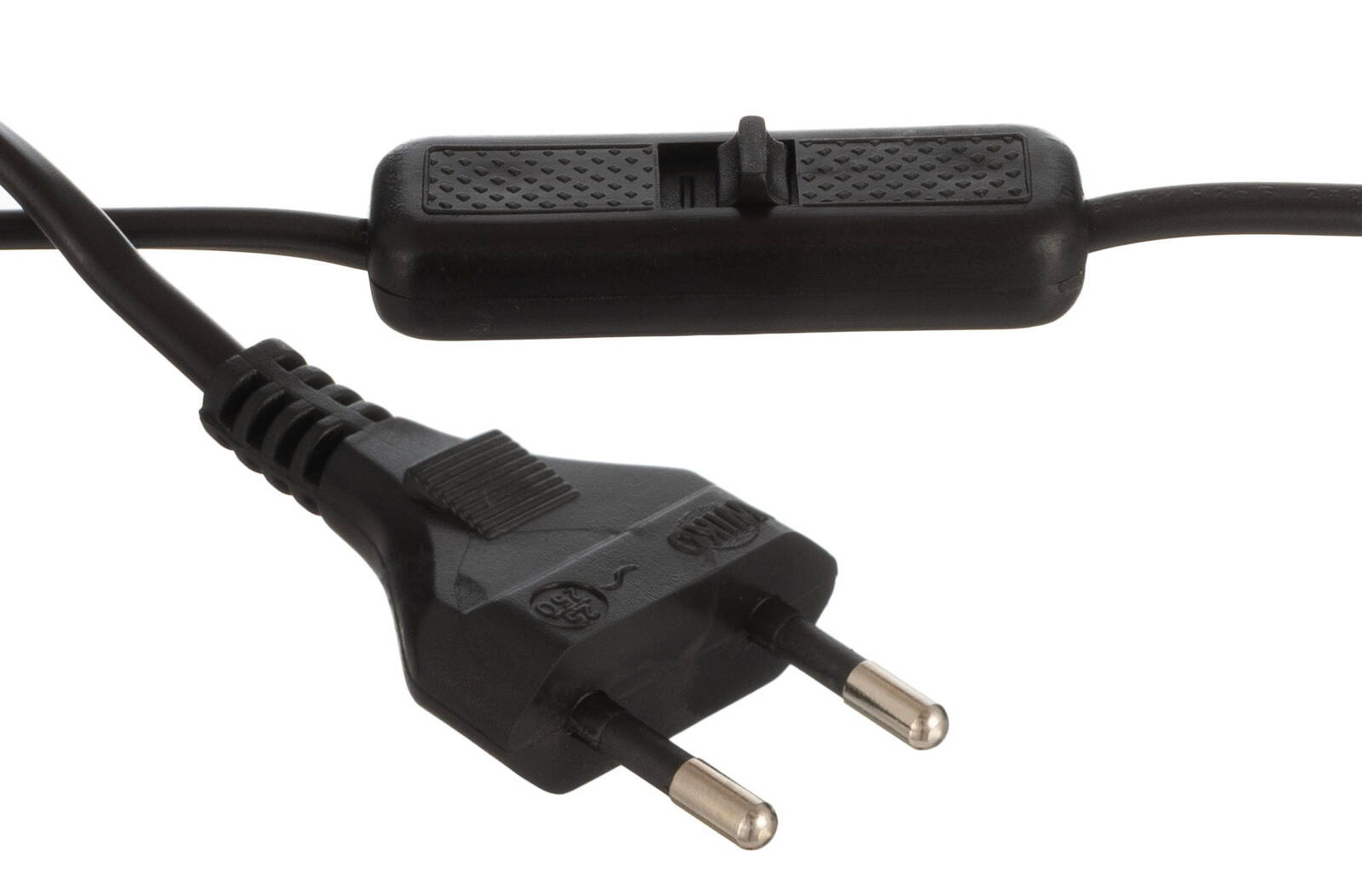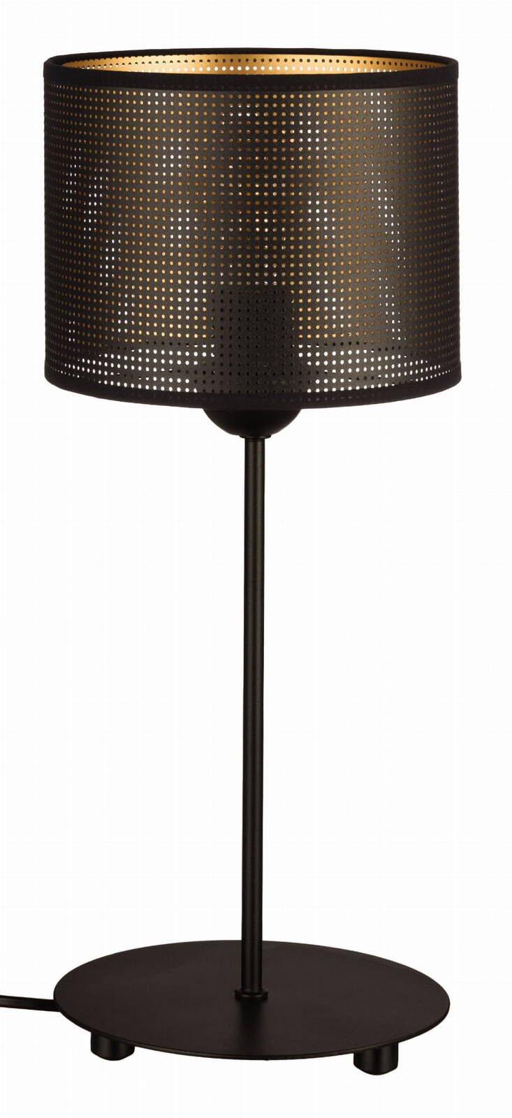 Lampka z czarnym abażurem w kształcie walca, wyposażona w kabel z włącznikiem ON/OFF.
