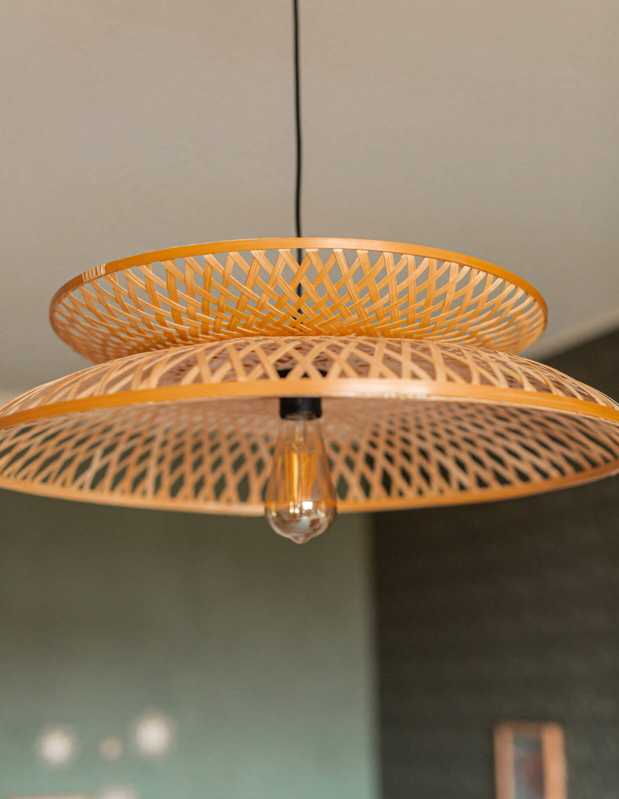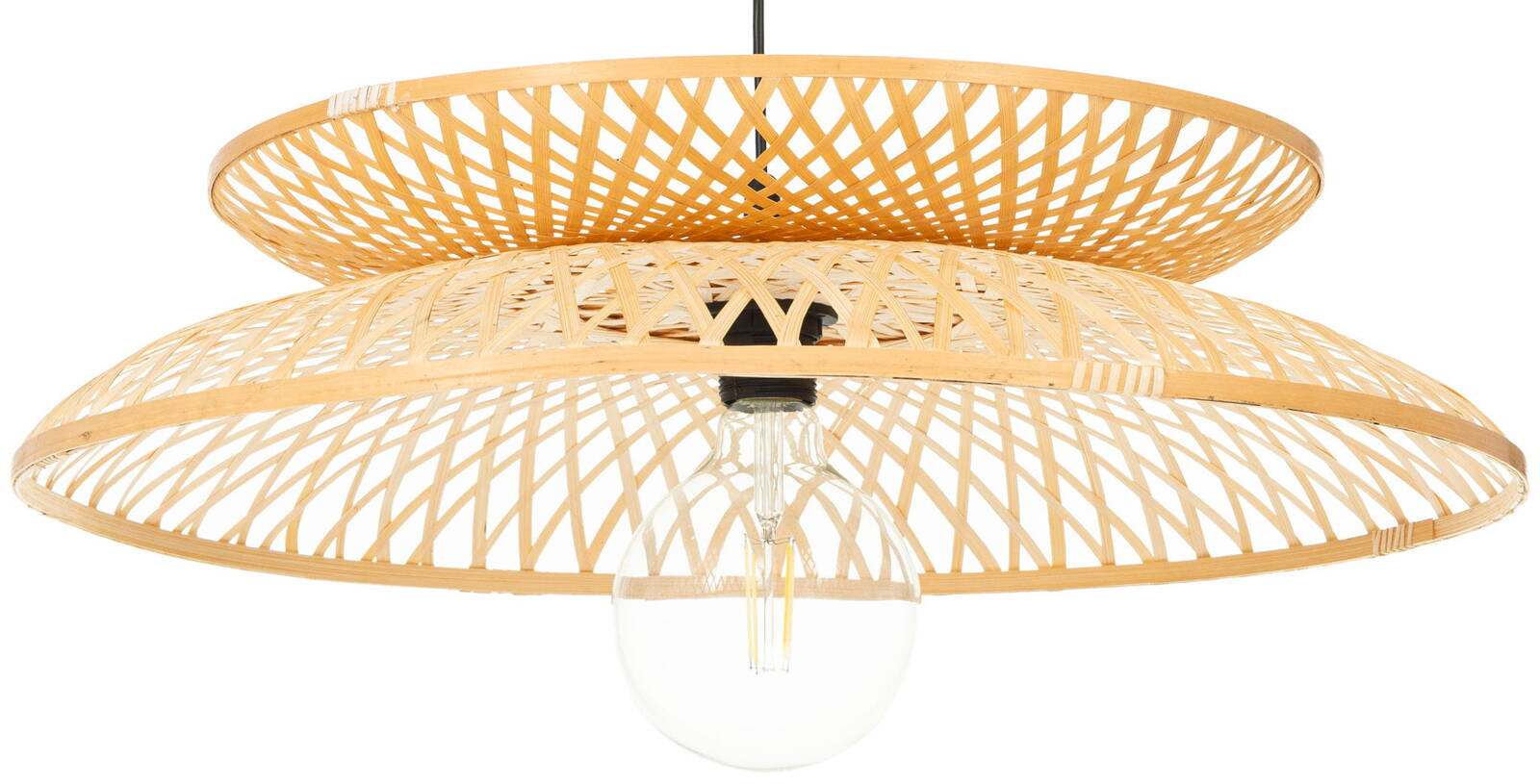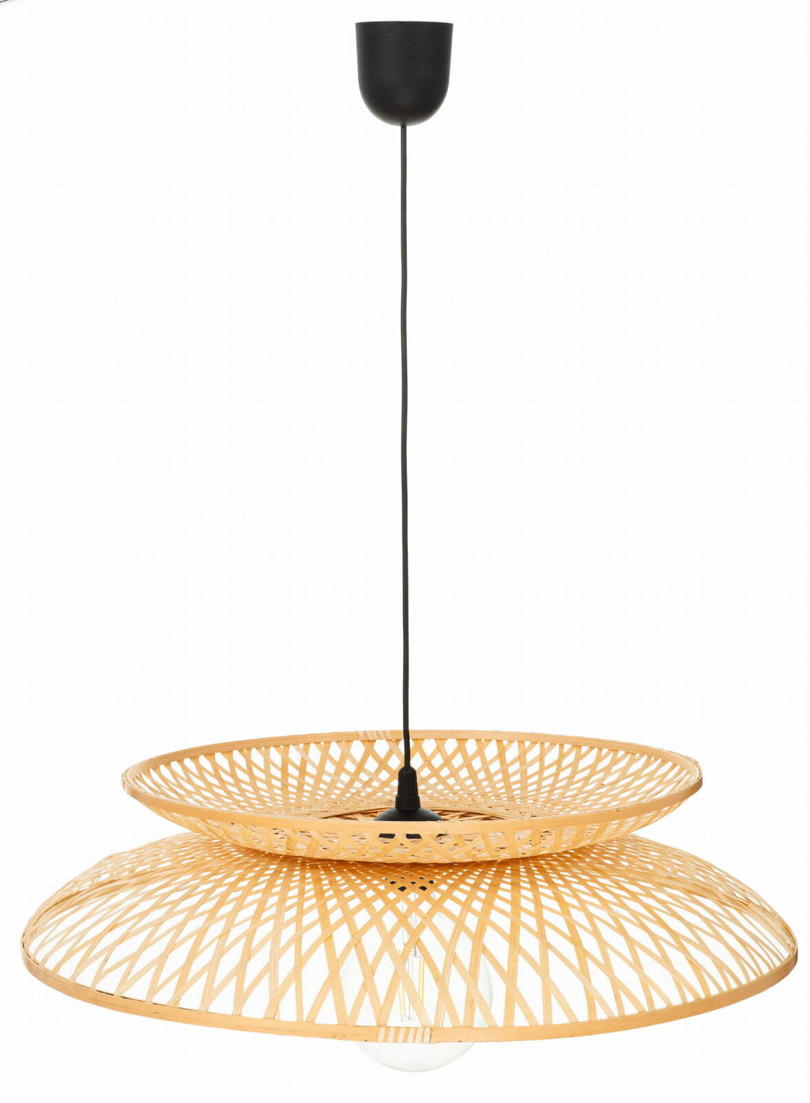 Lampa jest wspaniałą kompozycją światła i natury, która przenosi Cię w podróż do orientalnego spokoju. Wyjątkowy design tej lampy bazuje na harmonijnym połączeniu dwóch części w formie talerzy - okrągłych kształtów wykonanych z wytrzymałej plecionki bambusowej. Te pięknie utworzone koła splatają się ze sobą, tworząc spójny i harmonijny układ, a ich subtelne złączenie w dolnej części dodaje lampie charakterystycznego uroku.