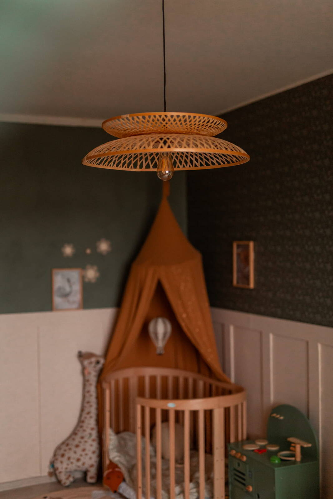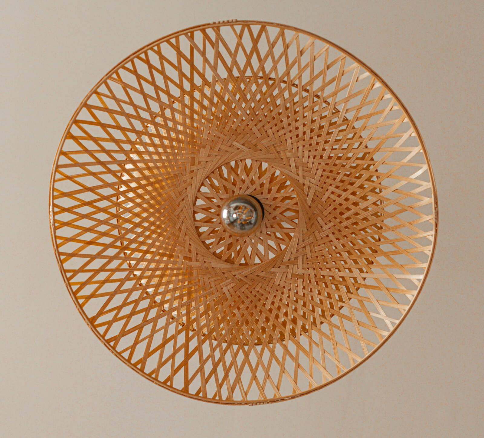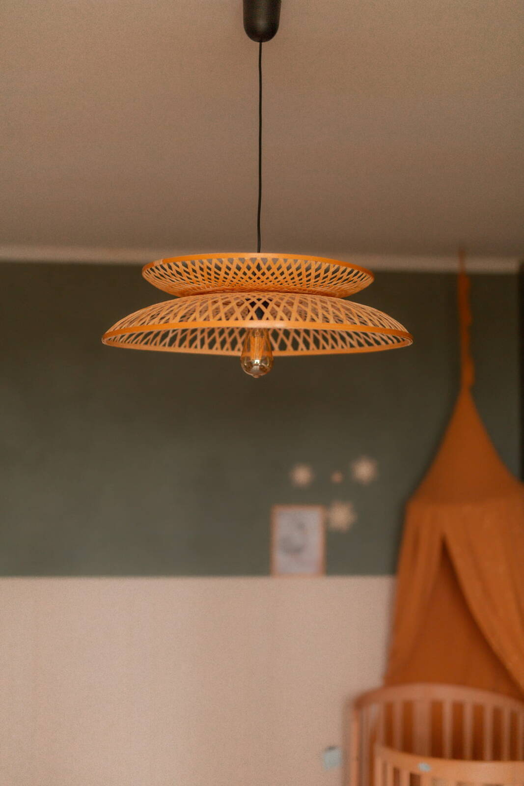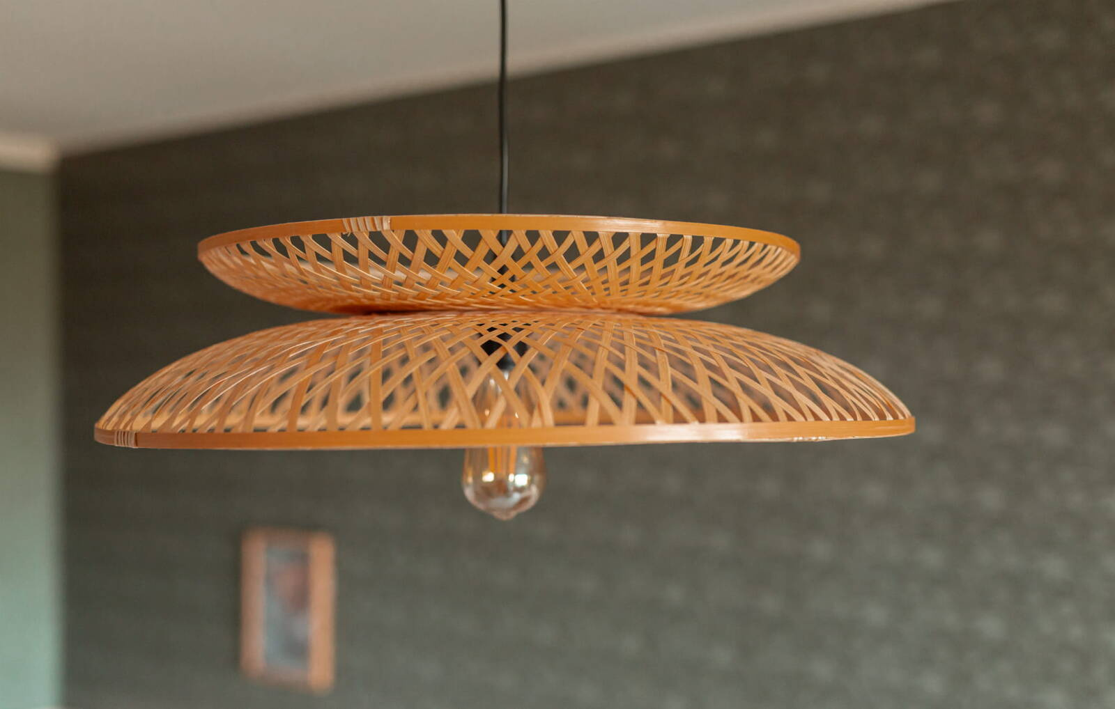 Lampa jest wspaniałą kompozycją światła i natury, która przenosi Cię w podróż do orientalnego spokoju. Wyjątkowy design tej lampy bazuje na harmonijnym połączeniu dwóch części w formie talerzy - okrągłych kształtów wykonanych z wytrzymałej plecionki bambusowej. Te pięknie utworzone koła splatają się ze sobą, tworząc spójny i harmonijny układ, a ich subtelne złączenie w dolnej części dodaje lampie charakterystycznego uroku.