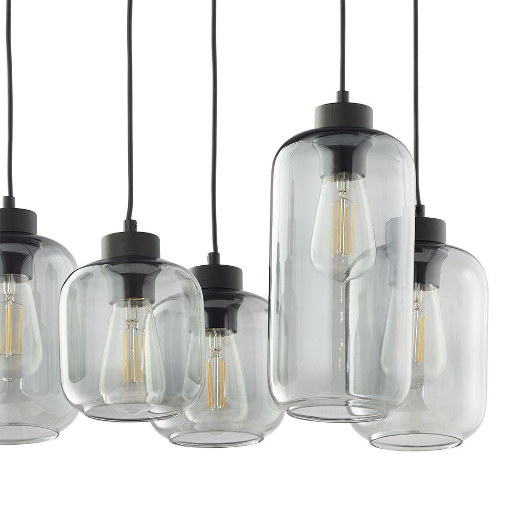 ,Minimalistyczna i bardzo subtelna lampa wisząca utrzymana w stylu glamour. Wyróżnia się prostą formą w połączeniu czerni oraz sześciu szklanych kloszy w kolorze grafitu, które pozwalają na idealne rozproszenie światła. Delikatne szkło nadaje lampie lekkości. Idealna propozycja do każdej nowoczesnej stylizacji wnętrz.