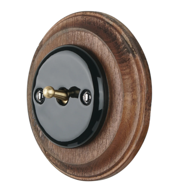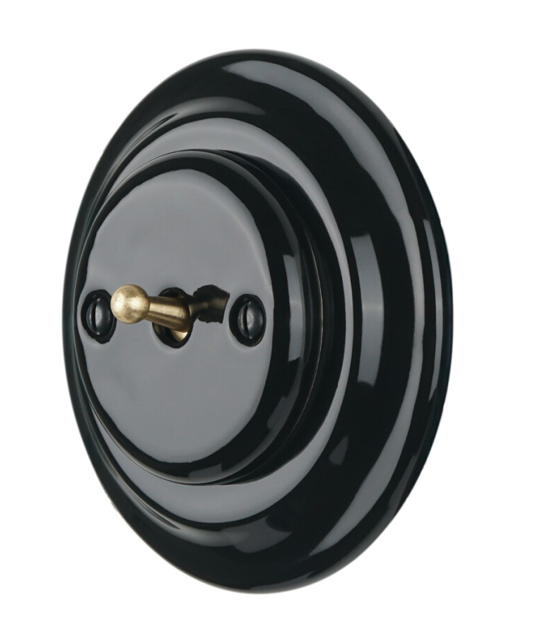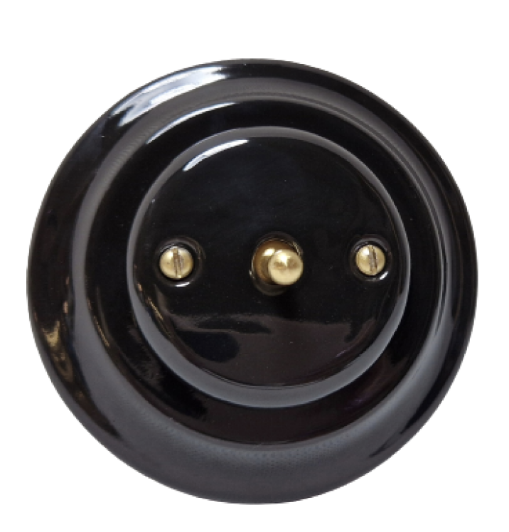 ,Elegancki włącznik pojedynczy ceramiczny. Montaż: podtynkowyy. Prezentowany włącznik jest sprzedawany bez ramki - co pozwala na samodzielne skomponowanie zestawu pojedynczego, podwójnego a nawet potrójnego ( ramkę drewnianą bądź ceramiczną można dokupić.) Kolor: czarny / złoty