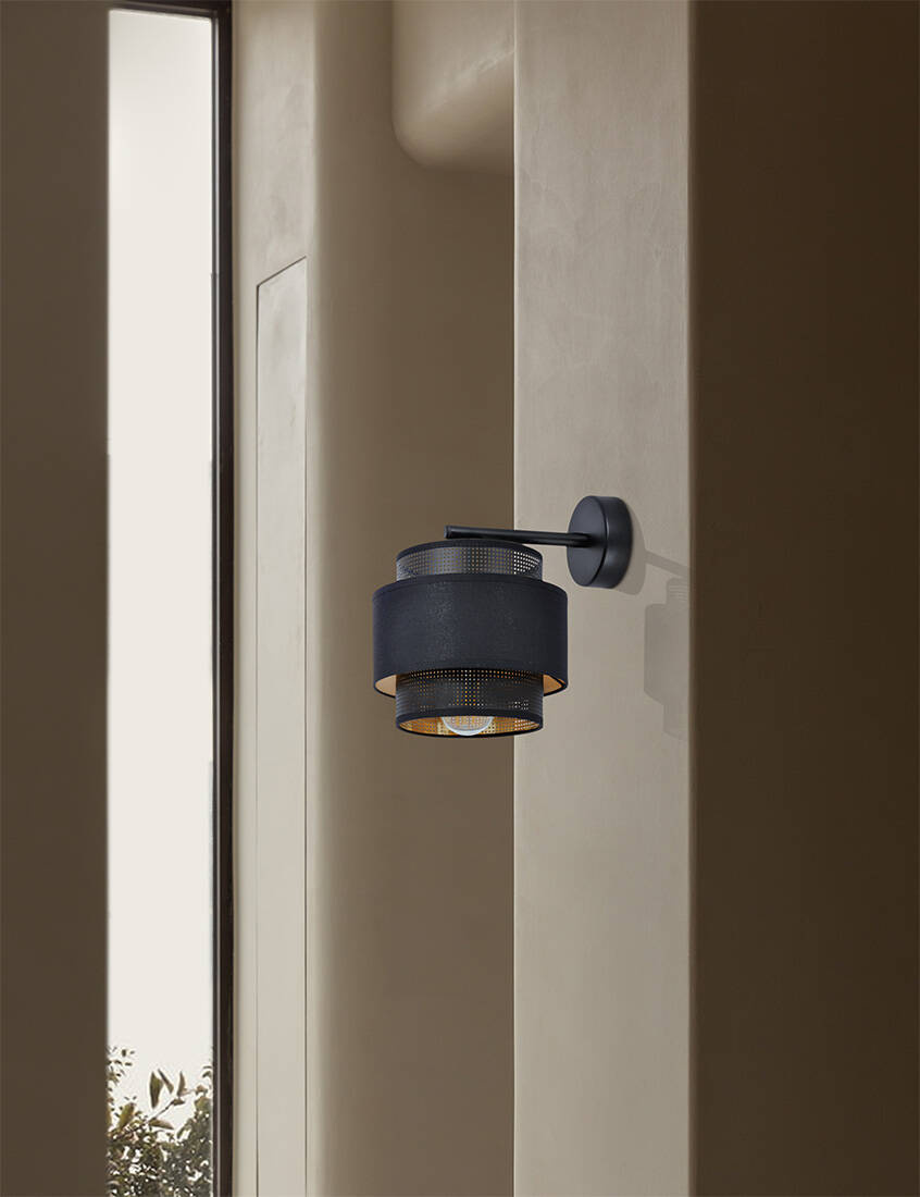 Pozwól, aby Twoje wnętrze zyskało wyjątkowy charakter dzięki lampie ściennej AMOS od Kaja Oświetlenie. Ta designerska lampa to połączenie nowoczesnej estetyki z funkcjonalnością, które zaspokoi gusta nawet najbardziej wymagających klientów. Lampa AMOS wyróżnia się minimalistycznym designem, który doskonale wpasuje się zarówno w nowoczesne, jak i klasyczne wnętrza. Jej elegancki, czarny abażur z subtelnymi perforacjami tworzy efekt gry światła i cienia, nadając przestrzeni wyjątkowego klimatu. Co więcej, czerń doskonale kontrastuje ze złotem, które pokrywa abażur od wewnątrz.